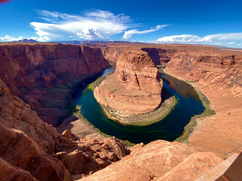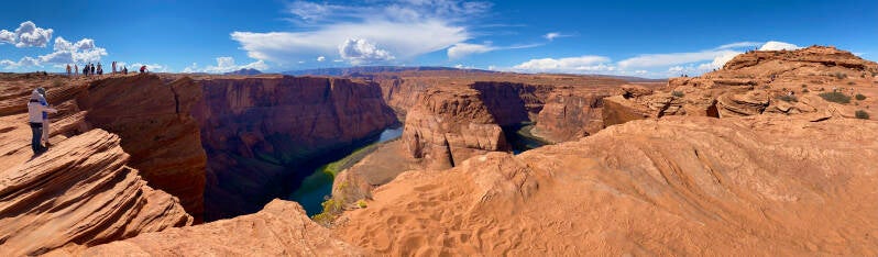 Page ist ein 7500 Einwohner Stadt in Arizona, 1255 m hoch und sehr gut an vielen Sehenswürdigkeiten gelegen. Durch den erneuten Zeitzonen Wechsel, liegen wir jetzt wieder 9 Stunden hinter Deutschland. Dadurch waren wir natürlich auch sehr früh schon an unserem heutigen Ziel. So blieb uns genug Zeit gleich eine kurze Wanderung zum Horseshoe Bend zu unternehmen.
