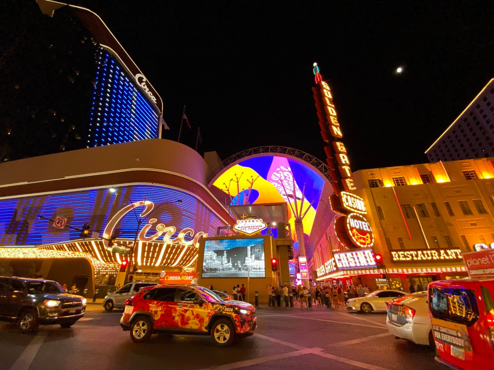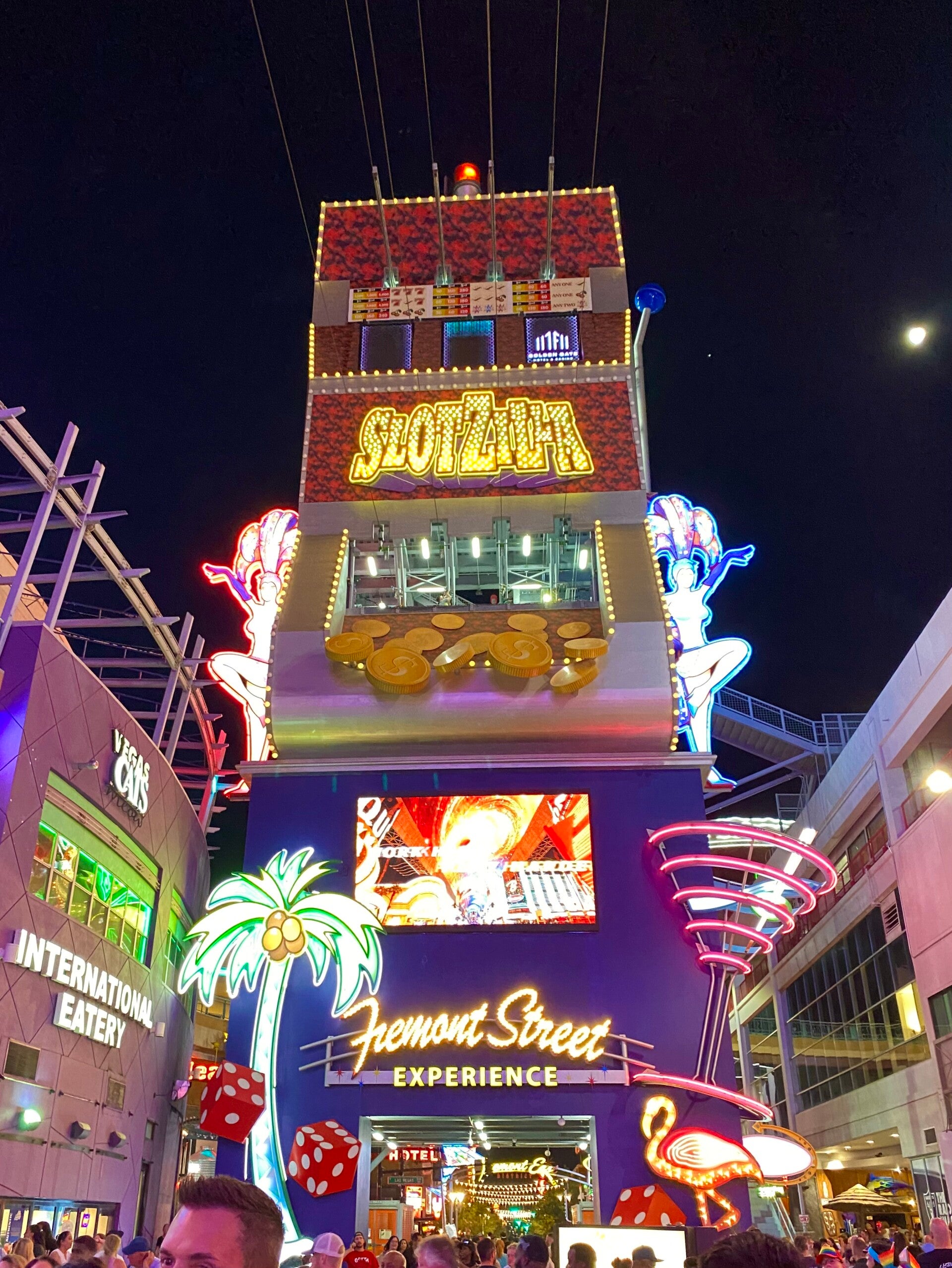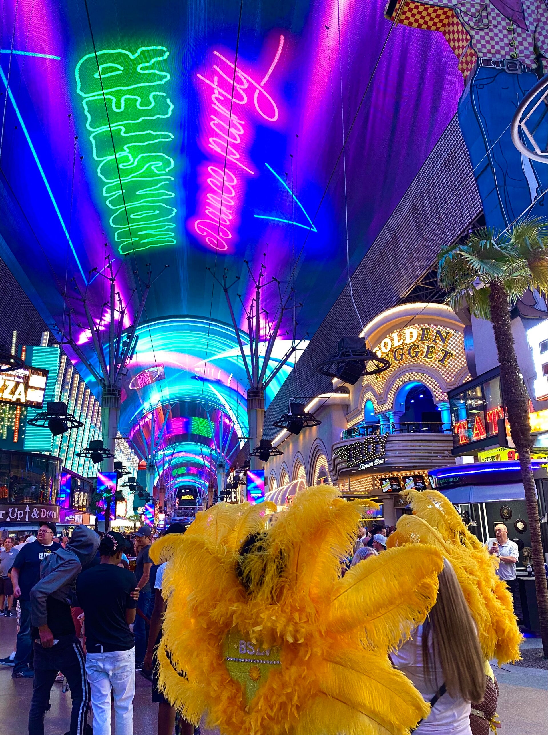Nach einer kleinen Erholungspause durften wir die Fremont Street bei Nacht erleben. Eigentlich eine ganz normale Straße für Autos, wurde sie vor einigen Jahren zur Fußgängerzone und mit einem gewaltigen Bildschirm überdacht. Auf verschiedenen Bühnen gibt es den ganzen Abend Live Musik und zu gewissen Zeiten Shows auf dem Bildschirmdach. Dazwischen düsen wagemutige Menschen an zwei verschiedenen Zippline die Straße entlang. Hier trifft sich alles, es gibt kaum einen Menschenschlag den man hier nicht sieht. Und jede Menge schräge Gestalten.