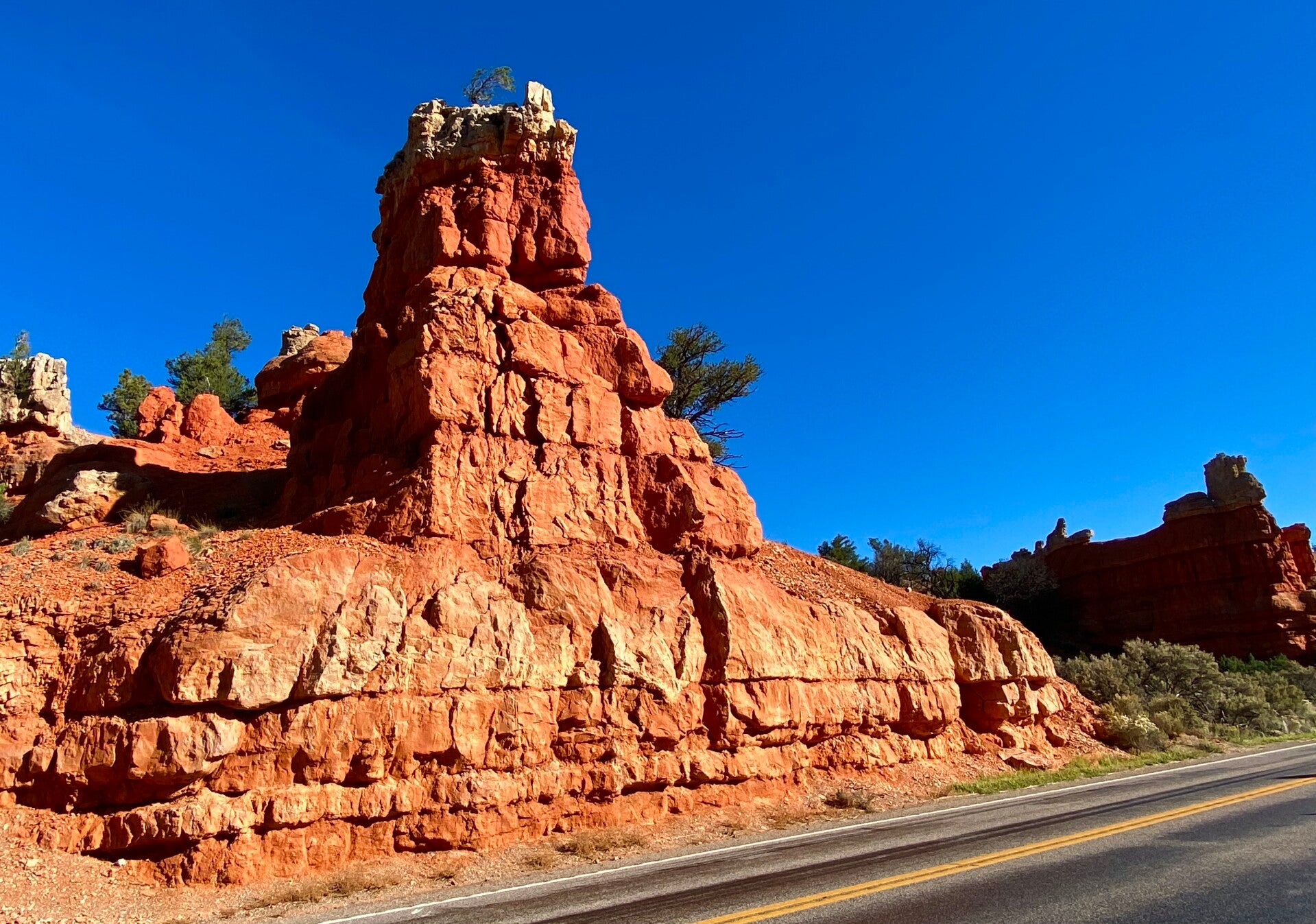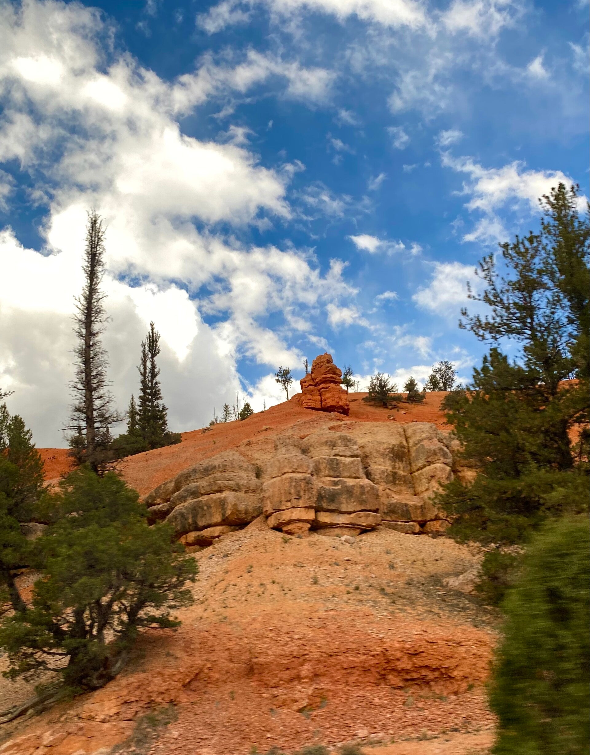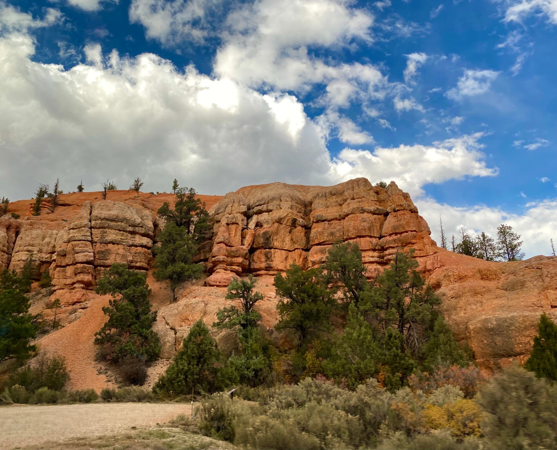 Heute ist Sonntag der 9. Oktober und unser heutiges Ziel ist der Bryce Canyon Nationalpark. Für die Erhaltung der Parks wird natürlich Eintritt erhoben. Bei der Überlegung ob einmalig Eintritt oder gleich eine Jahreskarte - wir möchten ja noch weitere Parks besuchen - stieß unserer Mitfahrer auf eine tolle Einrichtung. Es gibt für USA Bürger eine Seniorcard. Ist man über 62 und hat einen amerikanischen Pass, kann man für den Preis einer Jahreskarte die Seniorcard erwerben. Die ist dann aber lebenslang gültig. Hier denkt der Staat an seine Senioren. Toll gemacht. Also machten wir uns nach einem Frühstück hier im Ranch House auf den Weg in den Canyon. Noch bevor wir zum Bryce Canyon kommen passieren wir den Red Canyon. Diese Farben sind atemberaubend. Man kann sich an den Felsformationen garnicht satt sehen. Auch hier ist natürlich ein Geocache versteckt, den man Mann gleich gefunden hat.