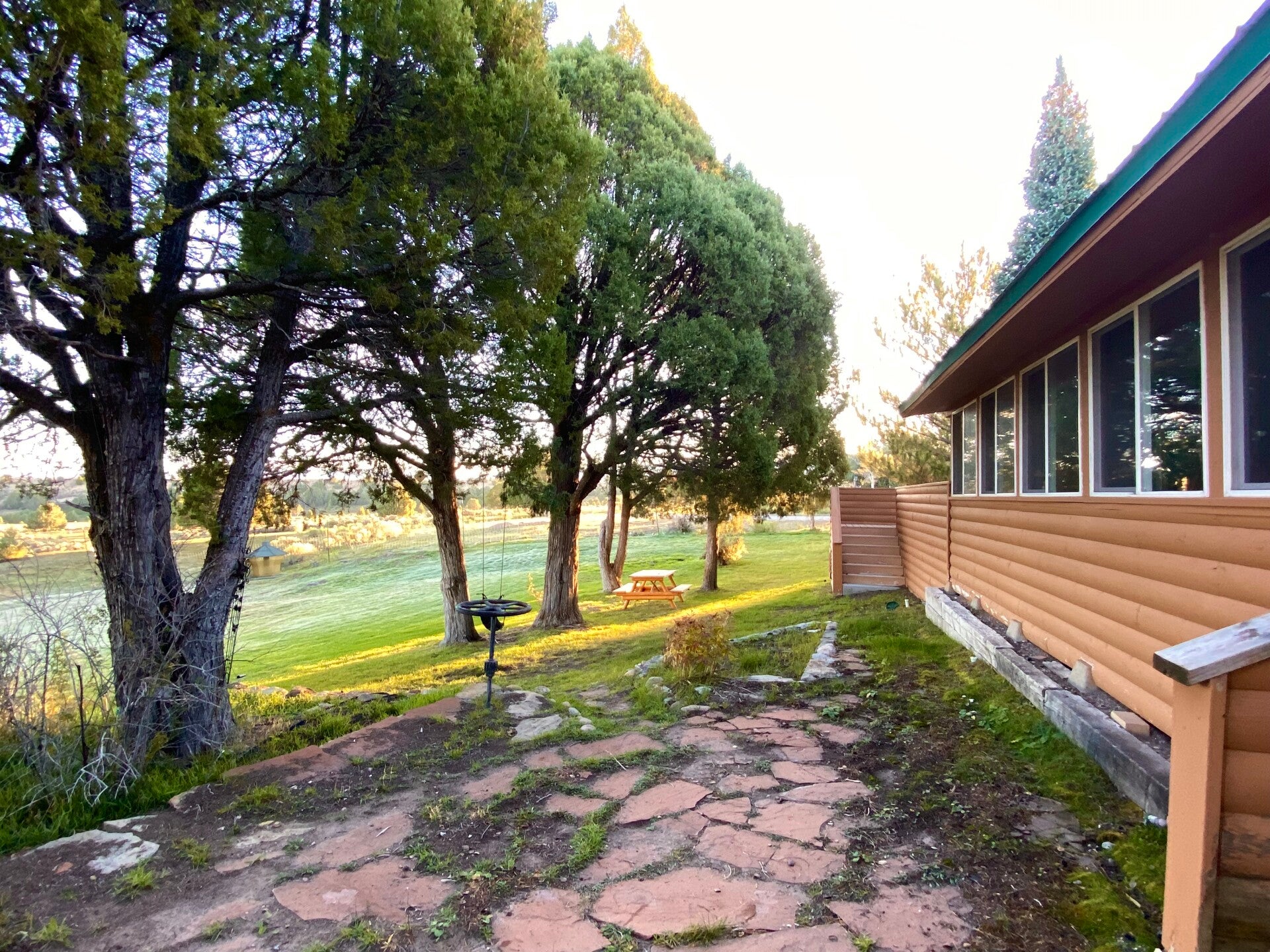 Der Tag war trotz viel im Auto sitzen anstrengend, also wurde der Abend kurz. Am nächsten Morgen erwartete uns bei 2 Grad Celsius ein schöner Sonnenaufgang. Hinter unserem Haus grasen gemütlich die 50 Rinder der Ranch.