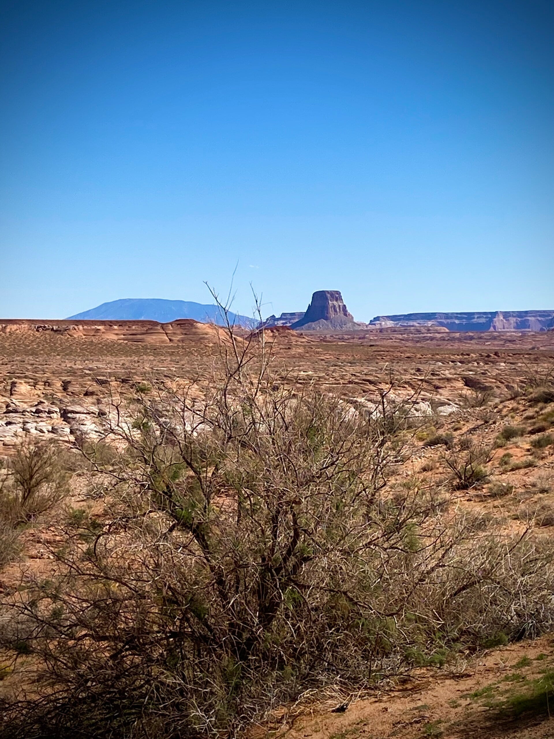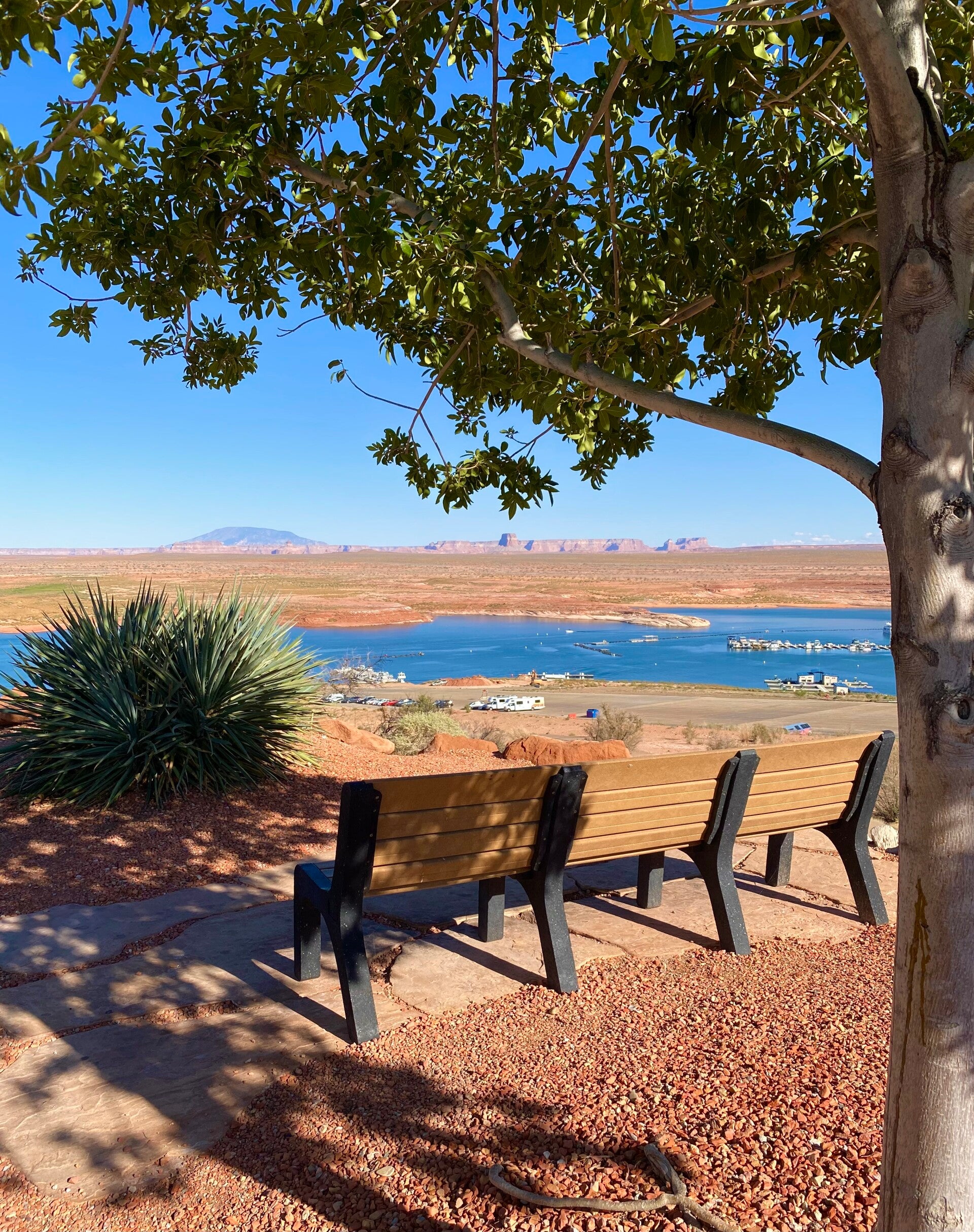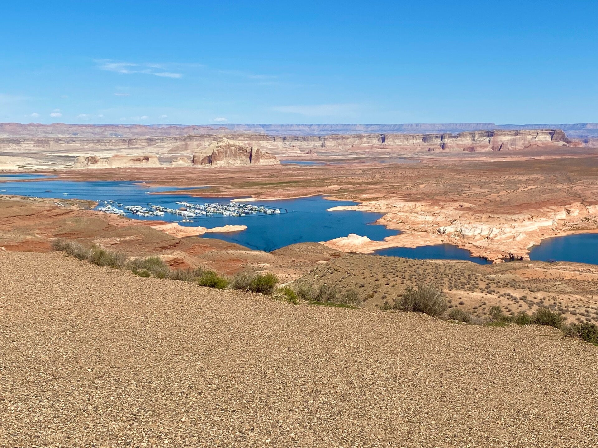 Hier am Antelope Point Marina, sind riesige Parkplätze die verwaist sind, es sind kaum Menschen da, es gibt auch nicht mehr viel zu sehen, da das Wasser sich sehr weit zurück gezogen hat. Der Lake Powell hat seit Jahren Probleme, dass der Wasserspiegel drastisch sinkt. Zu manchen Zeiten mehr als 40 Meter unter normal. Es gibt hier große Lagerplätze für Hausboote, die nicht mehr alle auf dem See untergebracht werden können.