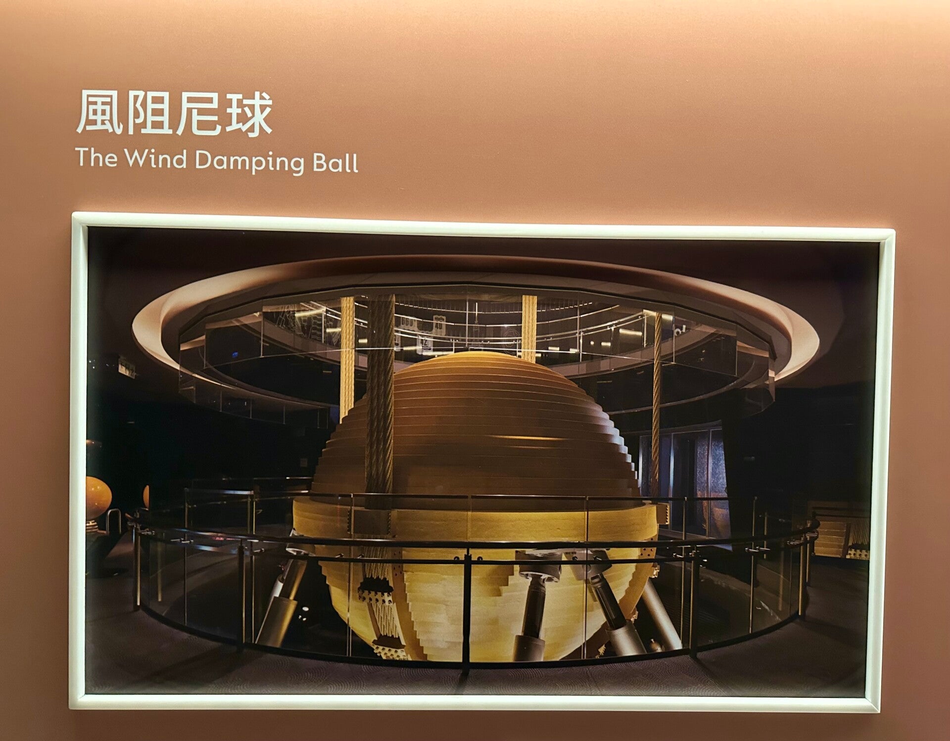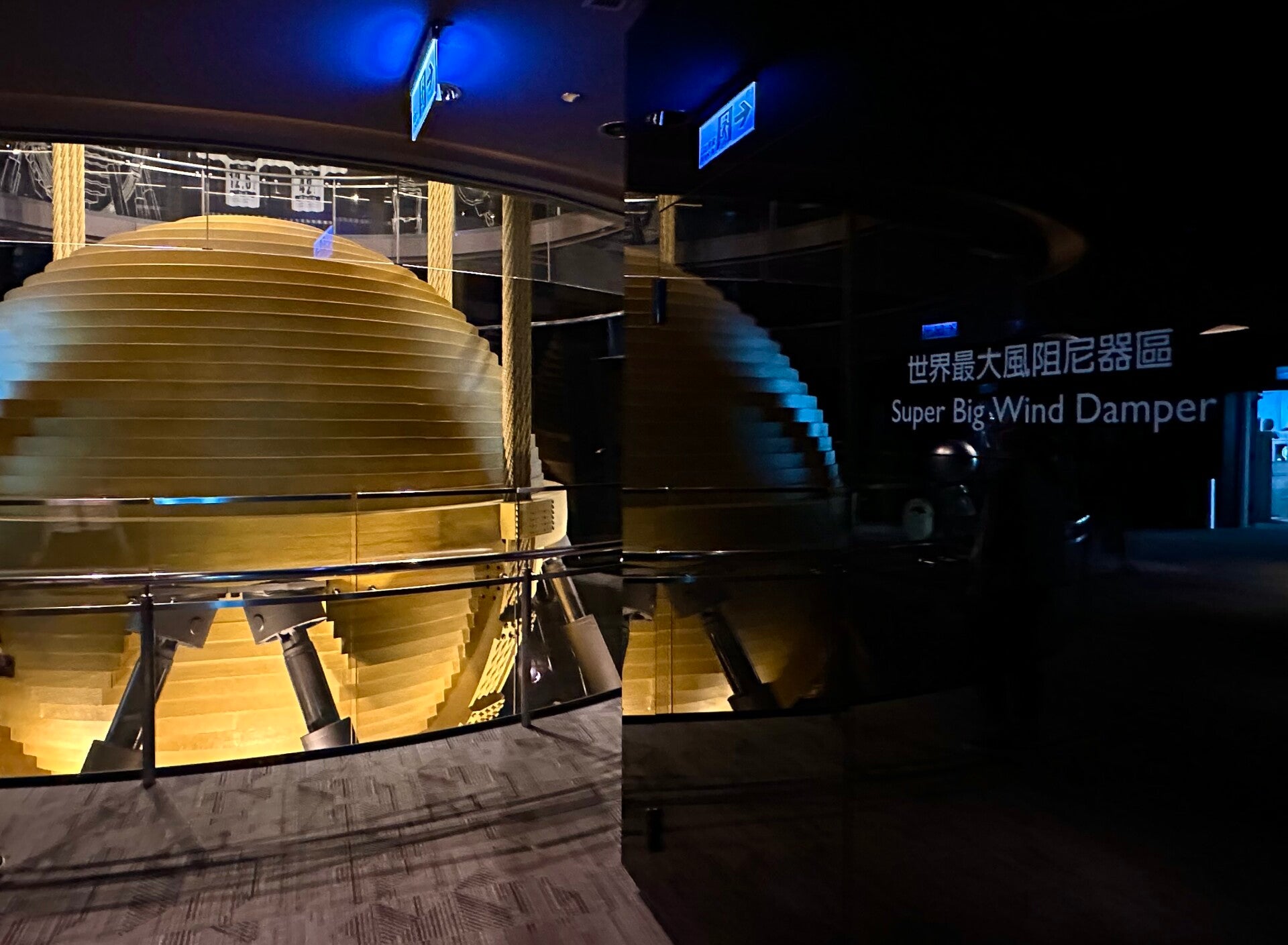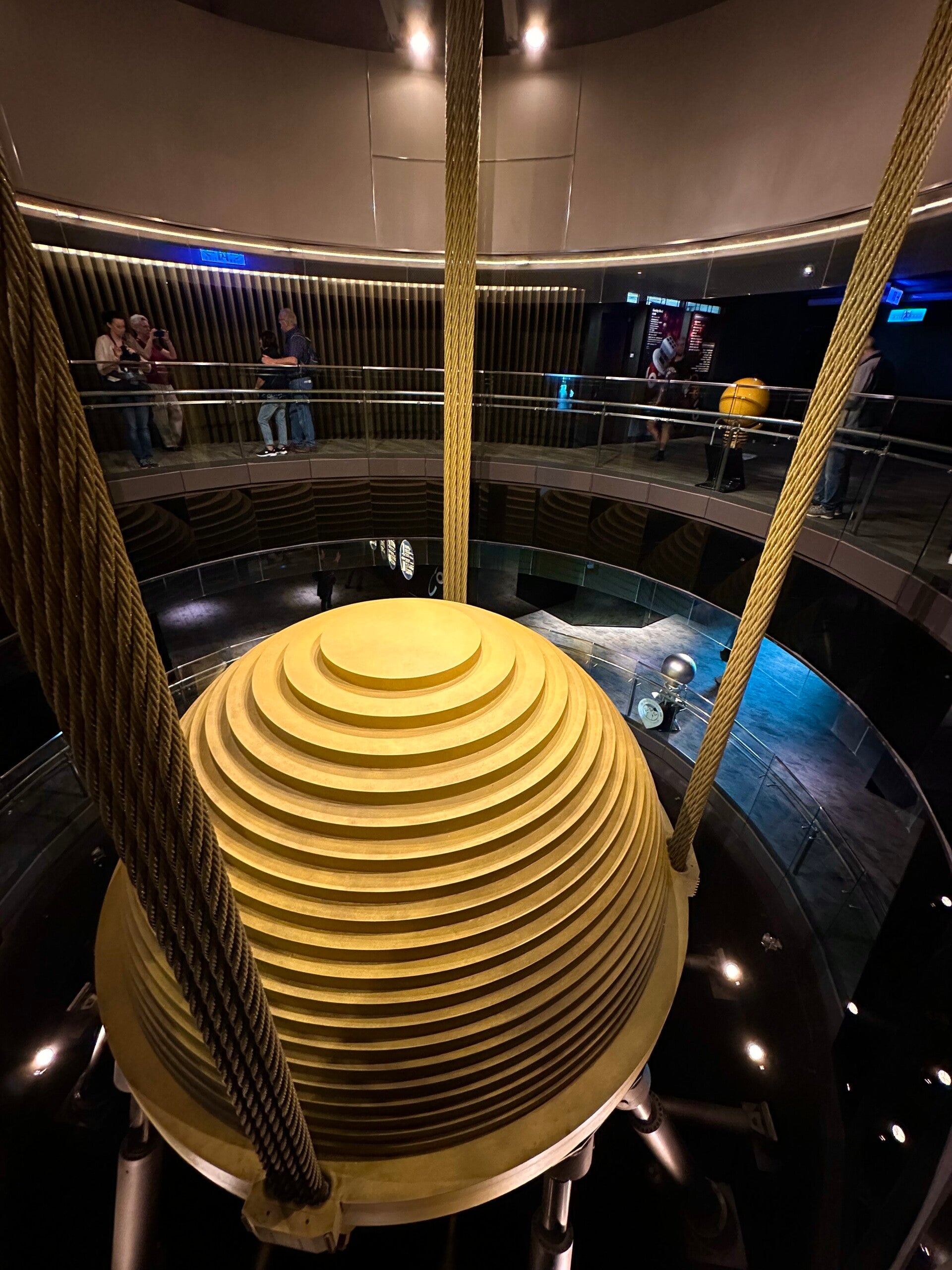 Die Freiluftplattform in der 90. Etage war auf Grund der schlechten Wetterverhältinisse leider für uns geschlossen, aber wir konnten von hier oben, im Inneren des Turmes das gigantische „Tigerpendel“ bestaunen.
