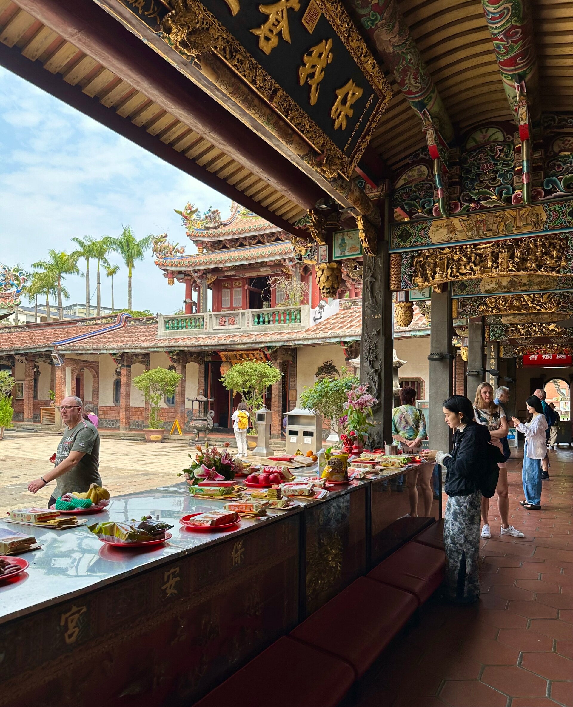 Dann erreichten wir den Boa`an Tempel. Eine schöne saubere Anlage mit viel Goldverzierungen. Wie überall in den Tempeln bringen die Menschen Opfergaben, Lebensmittel, für die Götter. Hier kann man sogar Tabletts mit Essen für die Mönche richten lassen. Man stellt sie einfach ab und die Mönche holen sich diese. Laßt die Bilder einfach auf Euch wirken.