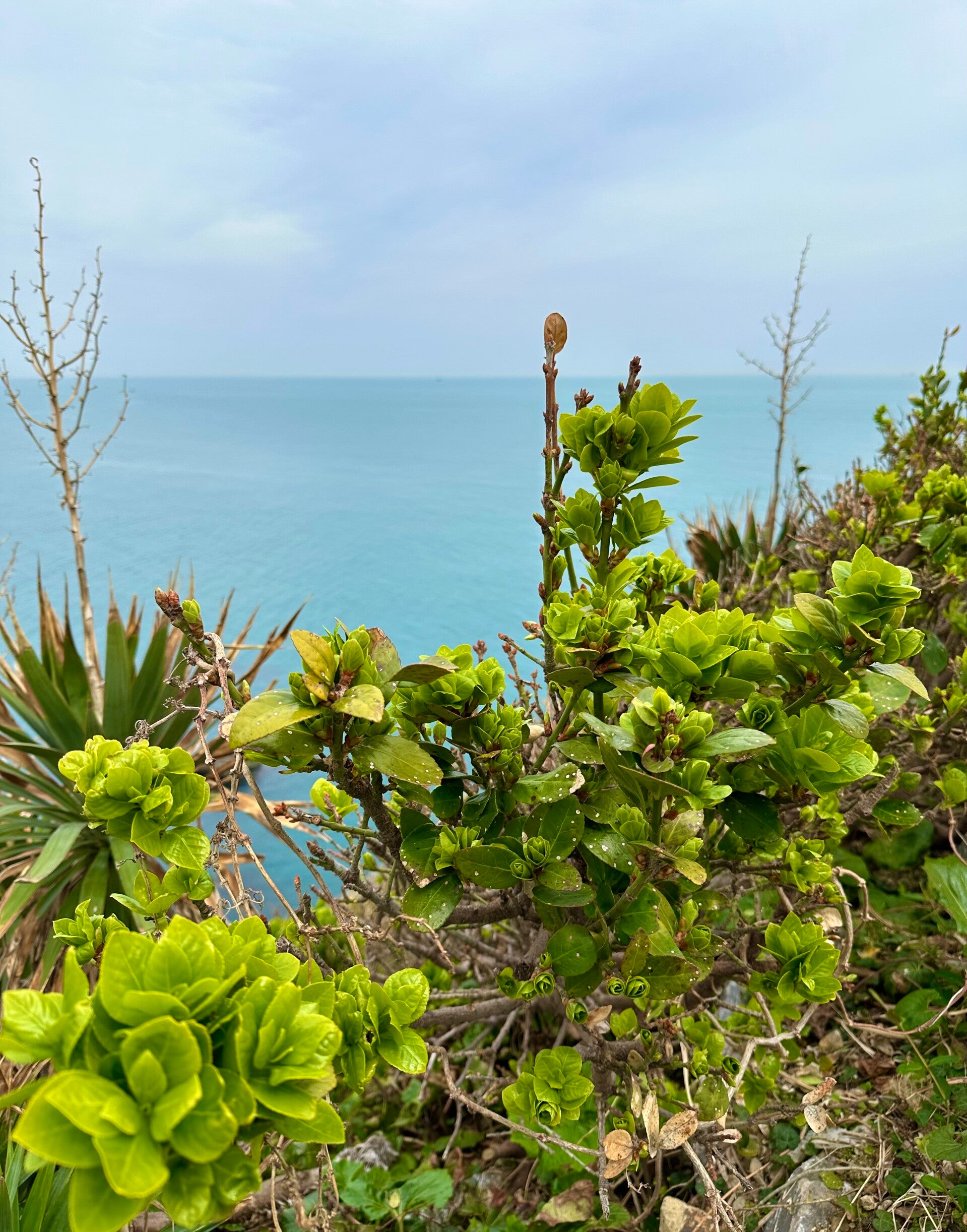 Von hier hat man einen beeindruckenden Blick auf die vorgelagerten Felsen die aus dem Meer ragen, und wir konnten nach rechts bis zu unserem Schiff im Hafen blicken. Hinter uns eine Wohnanlage, in der man mit diesem Ausblick natürlich horrende Mieten bezahlt.