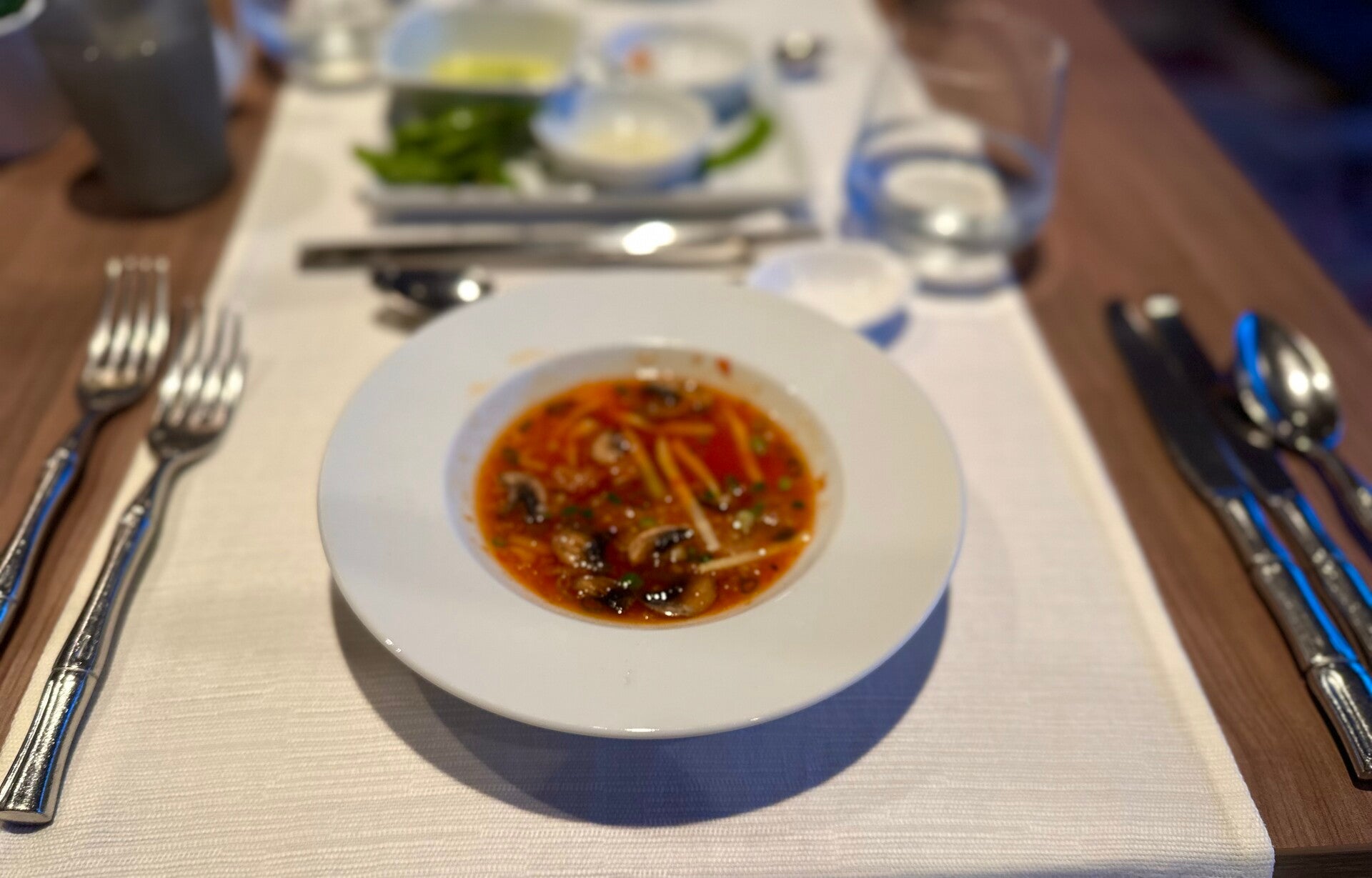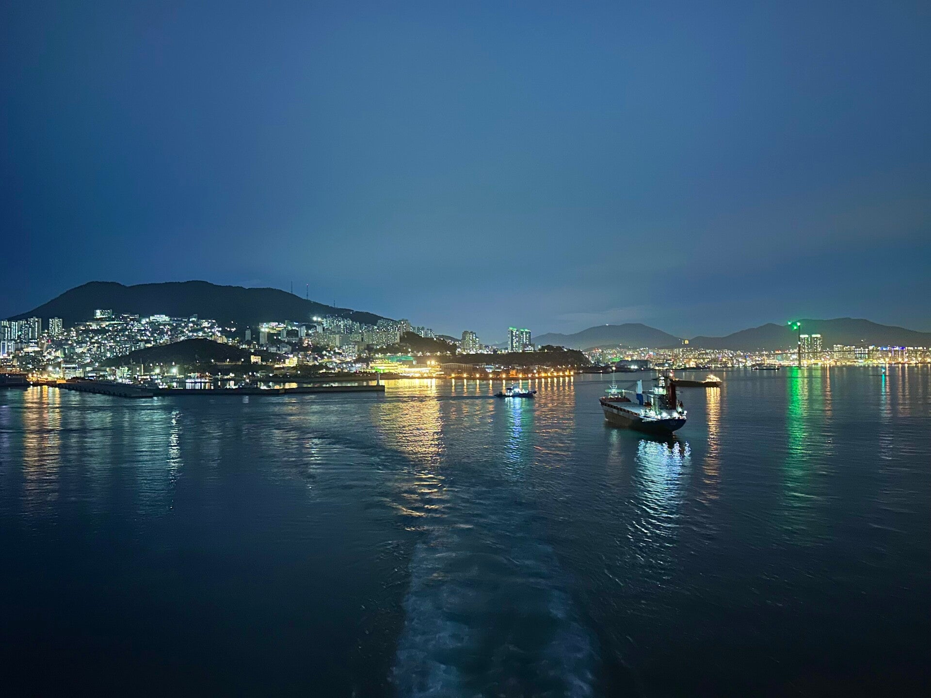 Nach einem Fischgenuß im Bedienrestaurant „Gosh“ genoßen wir unserer Abendessen, bevor auch wir den Hafen, vor der abendlich beleuchteten Skyline wieder verließen, und uns auf dem Weg nach Japan machten. Die Nacht war leicht unruhig, es gab etwas Seegang und wieder Regen, Regen, Regen.
