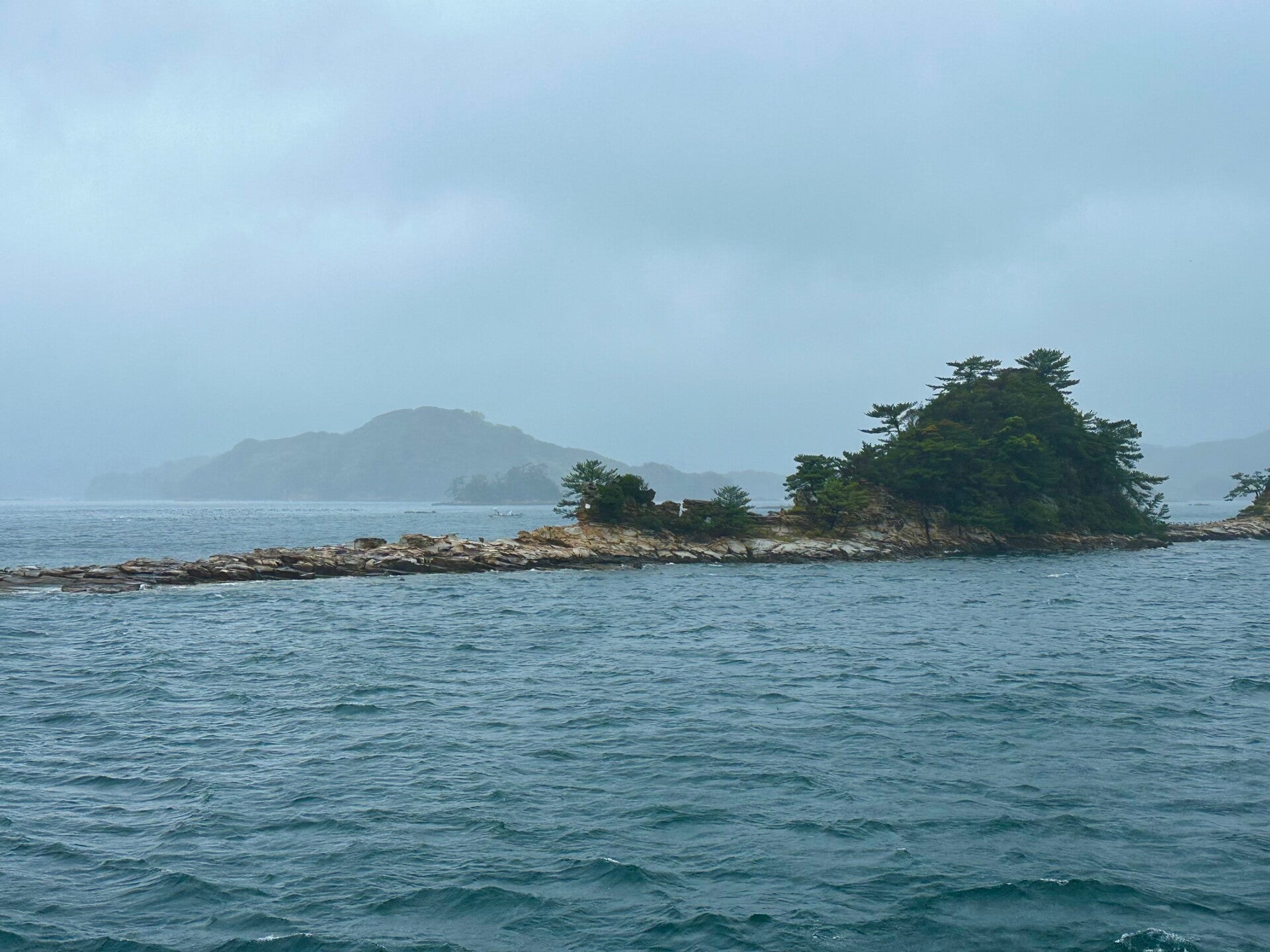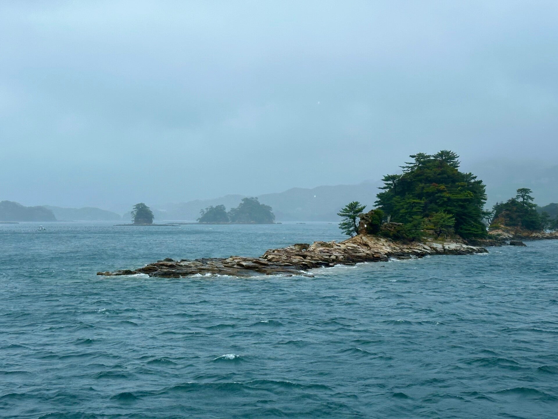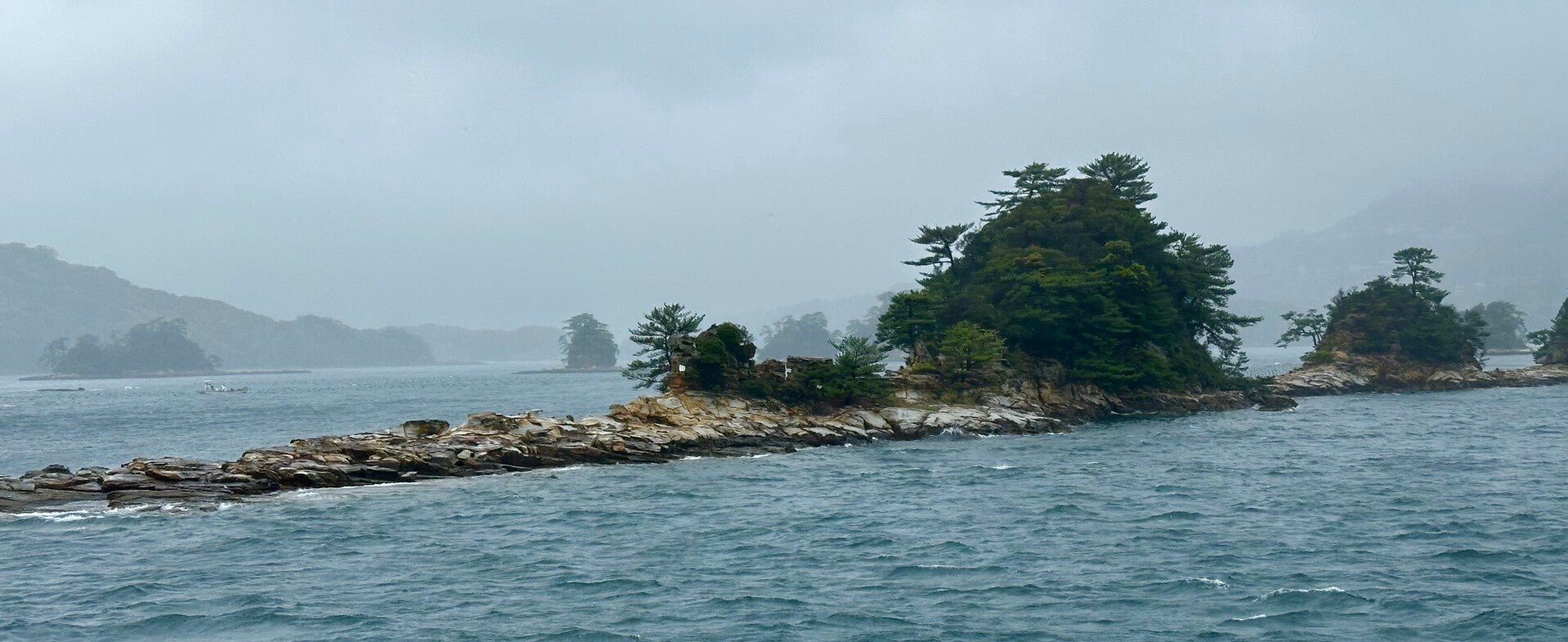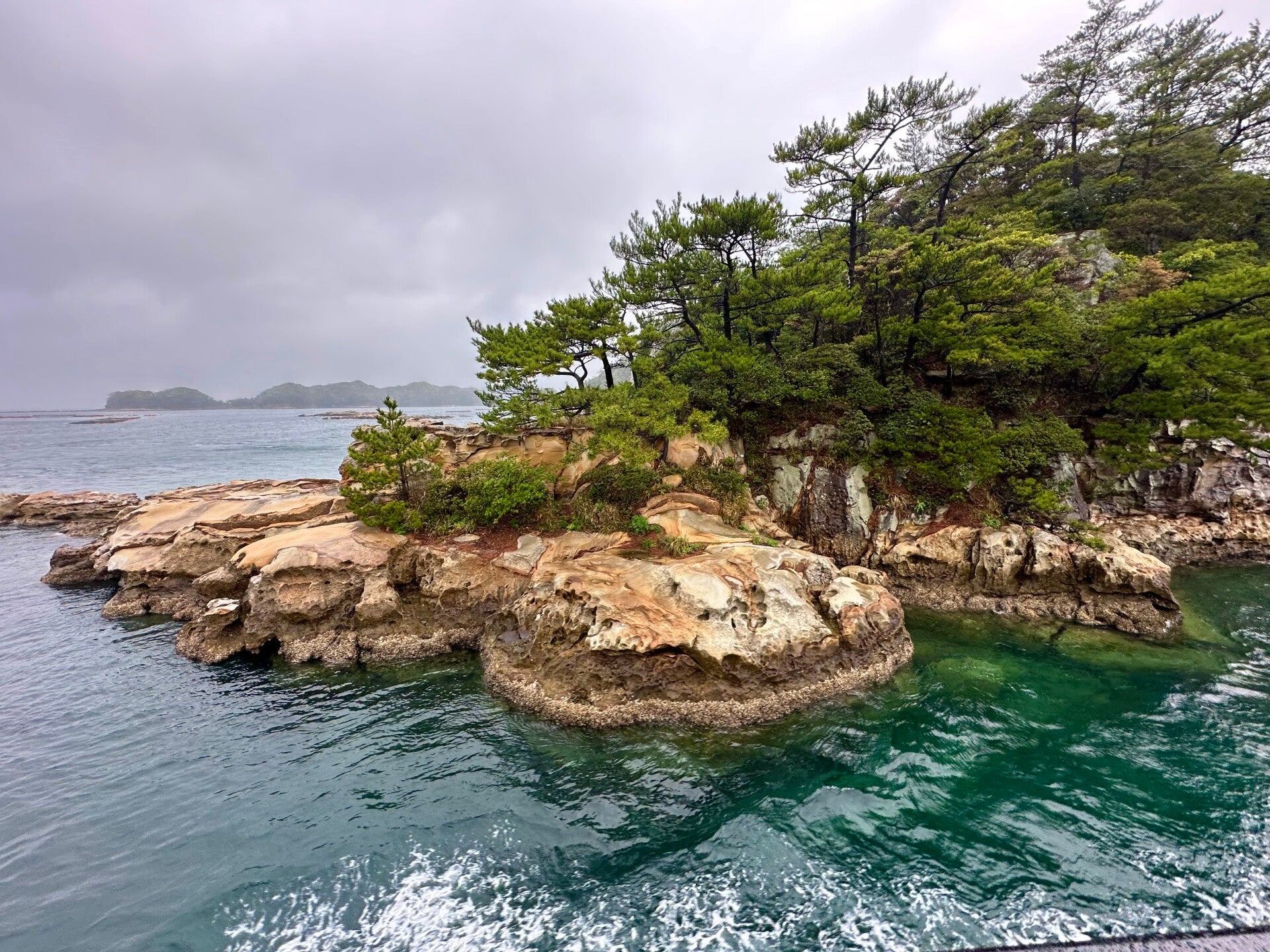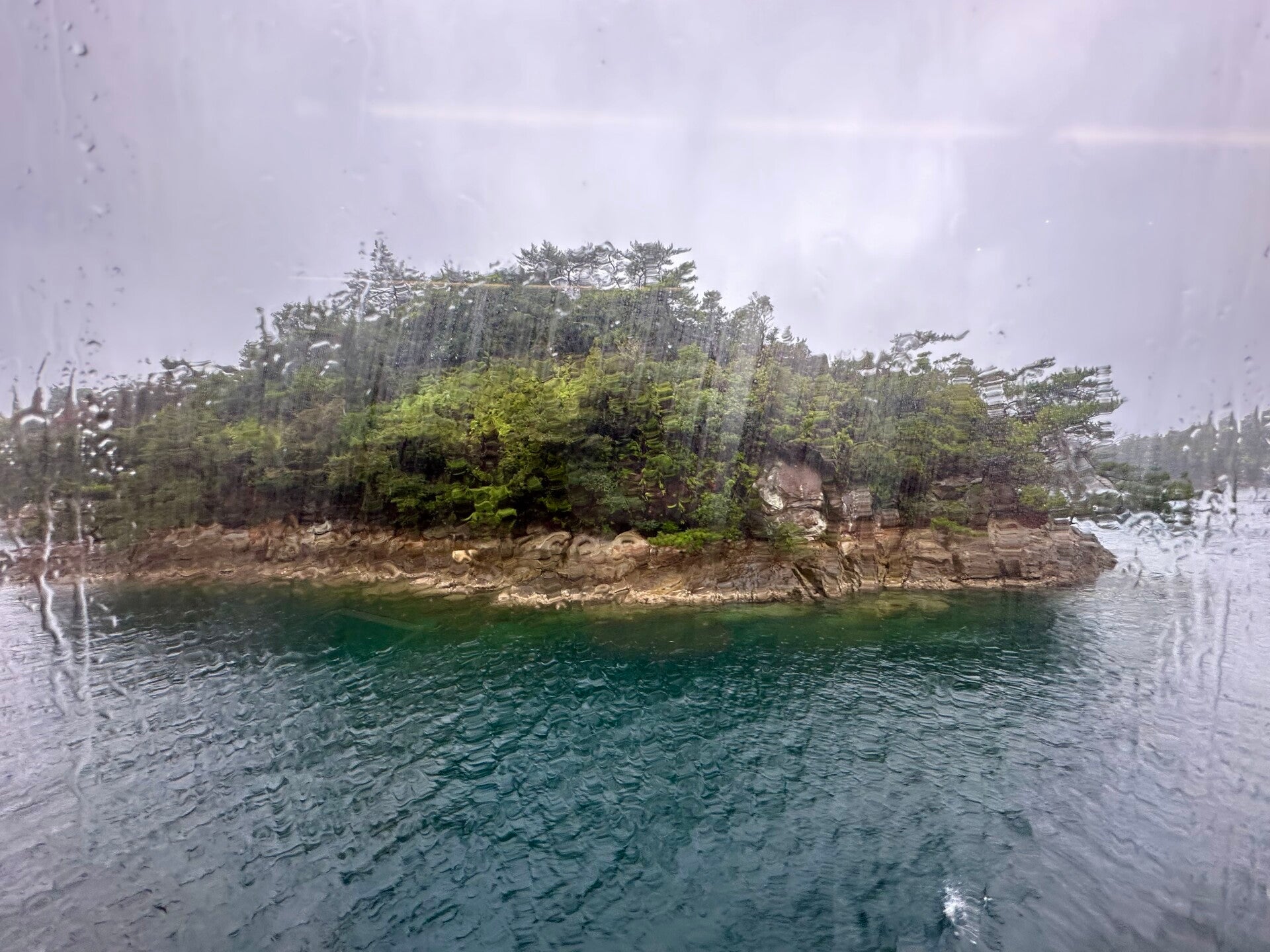 Die Fahrt durch die 99 Inseln, die sehr den Schäreninseln vor Schweden, oder den Thousand Islands in den USA gleichen, wäre sicher sehr schön geworden, hätten wir die Fahrt nicht im Innenraum hinter beschlagenen Scheiben verbracht. Beim Versuch auf dem Außendeck zu fotografieren, kam gleich noch ein Schwall Wasser dazu.