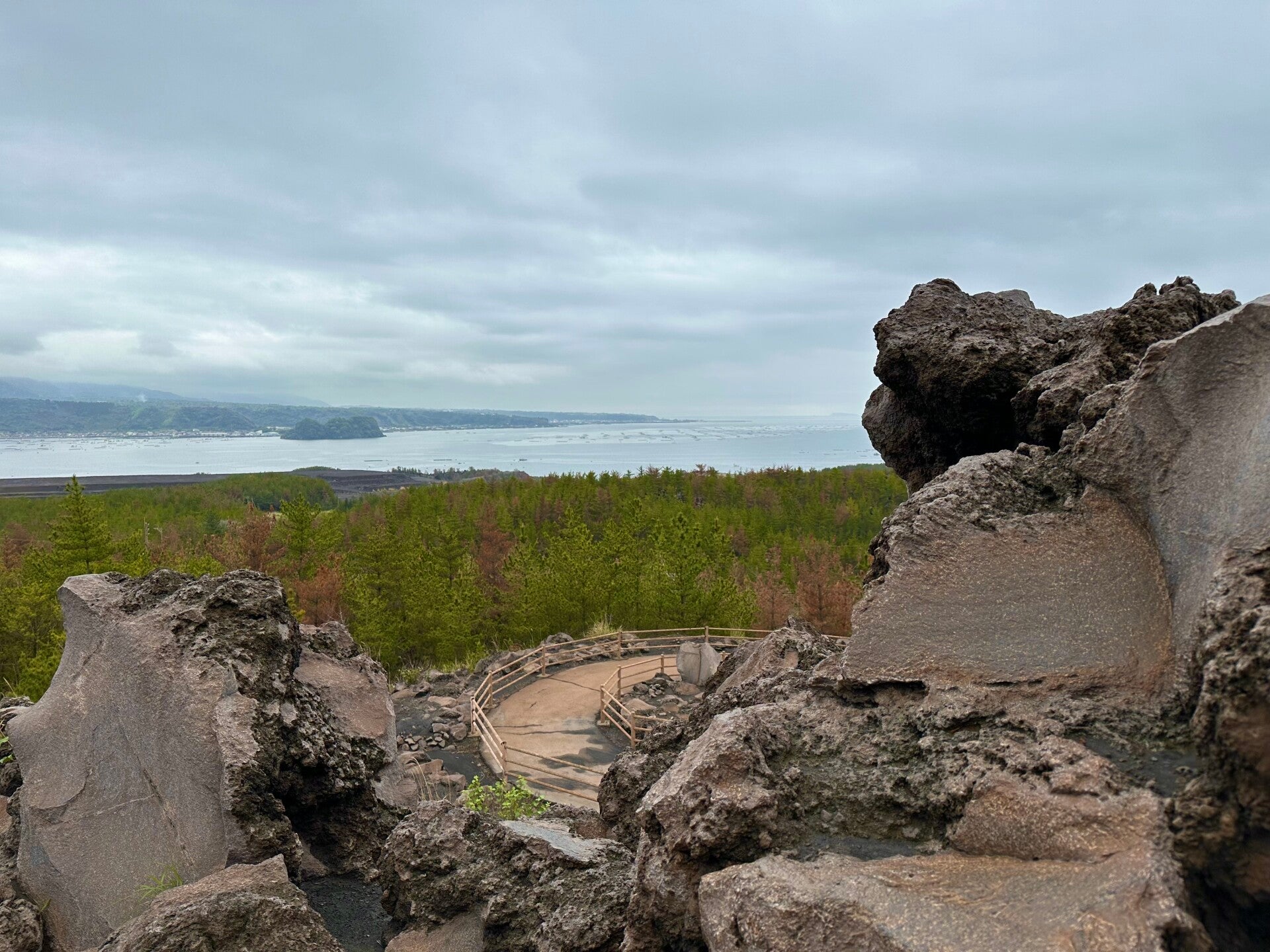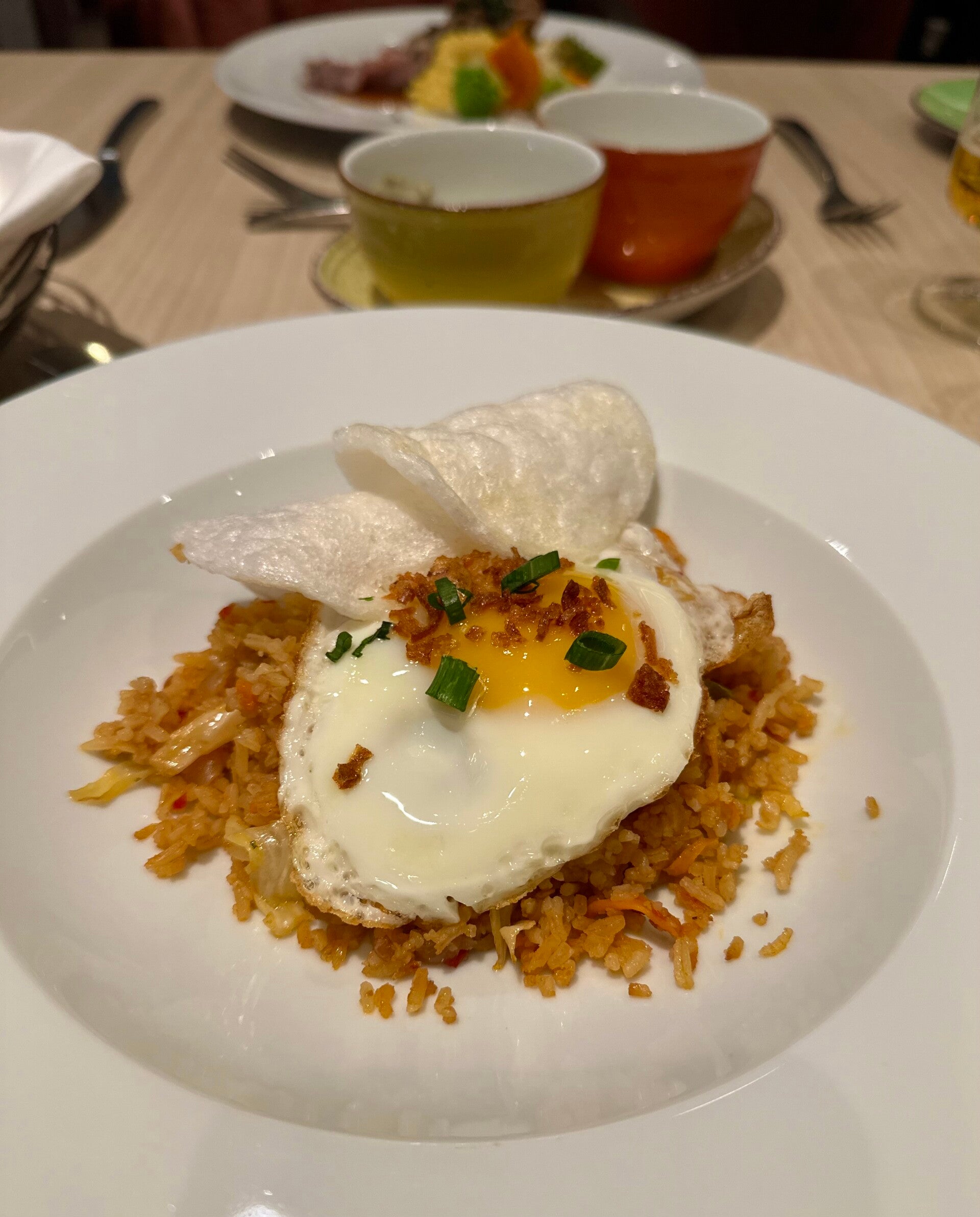 Der nächste Haltepunkt war der Viewpoint auf dem anliegenden Berg, der einen spektakulären Blick über die Inselwelt bieten sollte. Aber wie man sieht, sah man nichts. Da sah das Buffet, das uns im Hotel am Berg erwartete schon bessern aus, und steigerte unsere Laune wieder. Selbst das Hotel muss bei guter Sicht ein „Hinkucker“ sein.
