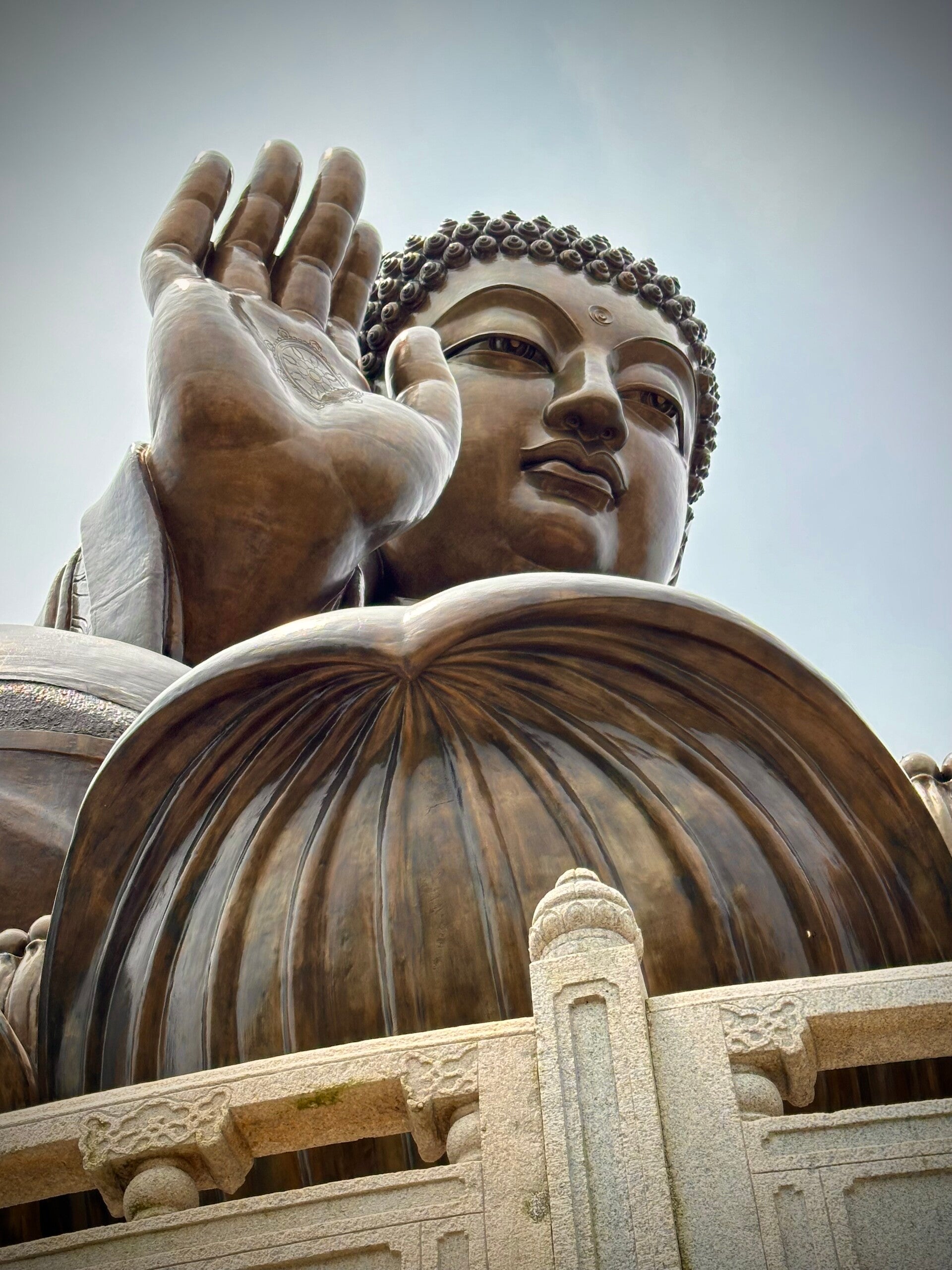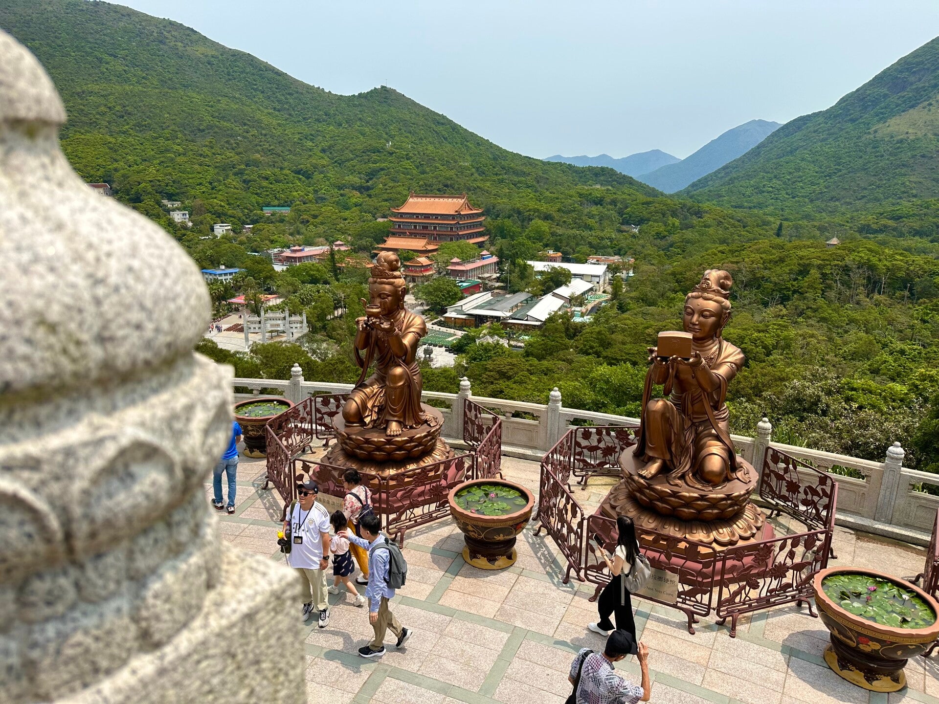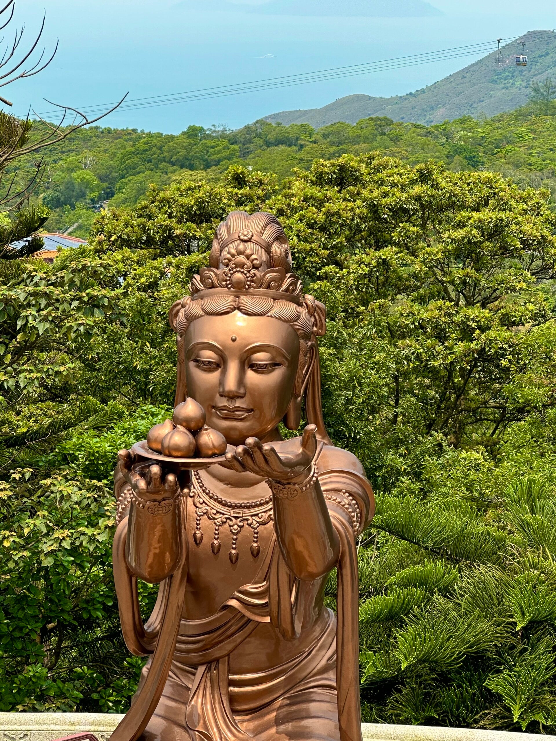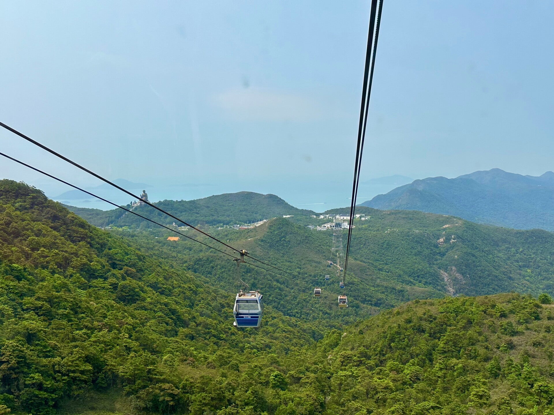 Der letzte Teil der Fahrt mit der Seilbahn, nach der letzten Umlenkstation, ging wieder leicht bergab, und wir hatten einen tollen Blick auf den "Großen Buddha". Eine Bronzefigur mit 35 Metern Höhe und einem Gewicht von 250 Tonnen.