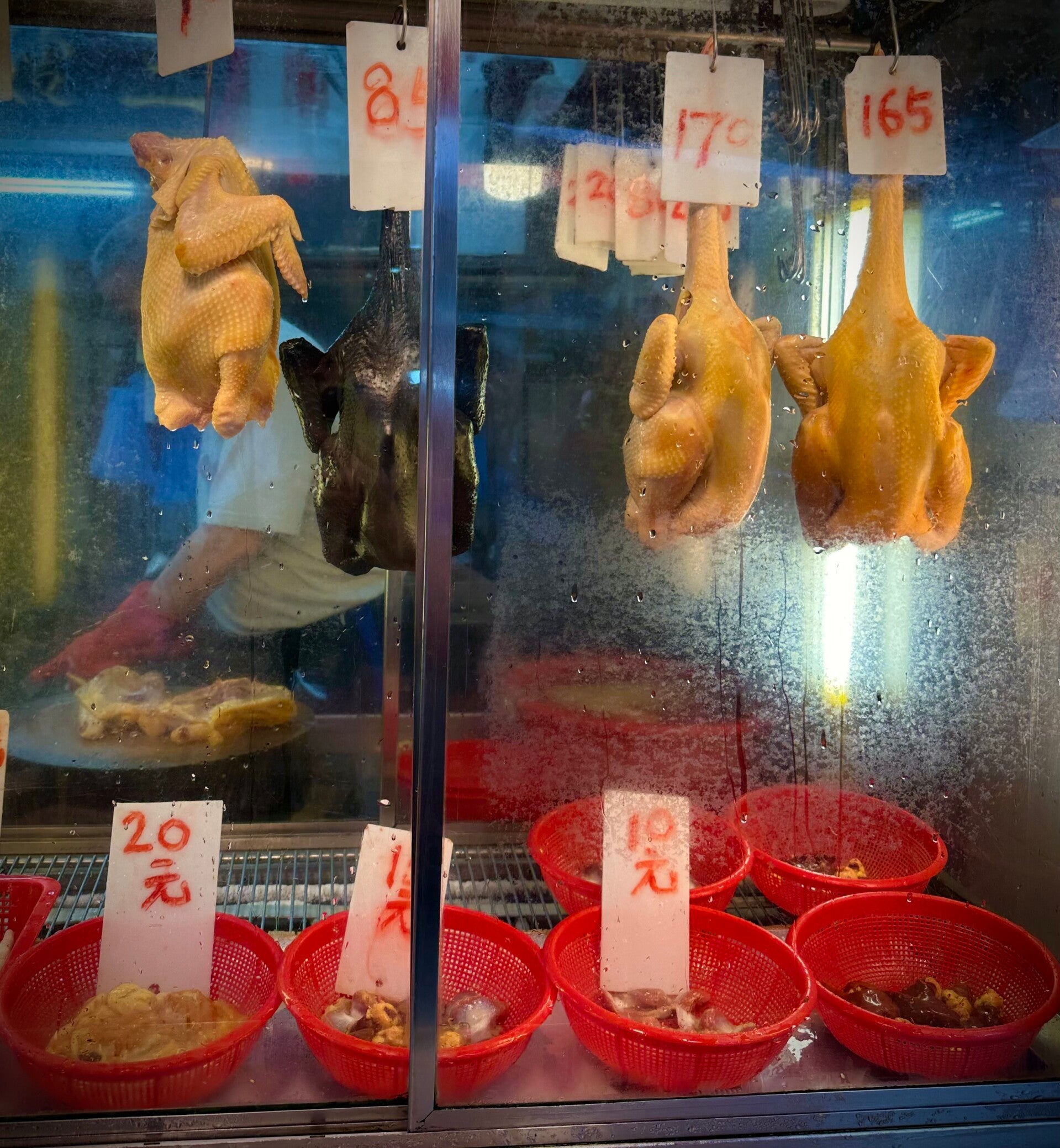 Weiter ging es zum Markt. Unsere Reiseführerin - eine kleine drahtige Chinesin, war ausgesprochen nett und um uns bemüht. Ihr Englisch super klar, sodass ich ihr auch mit meinen eher schlechten Englischkenntnissen doch gut folgen konnte. Deutschsprechende Reiseführer in einer solchen Gegend zu finden ist eher unwahrscheinlich. Unser erster Stopp galt einem kleinen Markt zwischen den Häuserschluchten. Hier konnte man frische, lokale Lebensmittel erwerben, und in den anliegenden Straßen auch alles was das Handwerkerherz höher schlagen lässt, oder auch Küchenutensilien. Ein Buchladen durfte natürlich auch nicht fehlen. Im Hauptgang gab es überwiegend Gemüse, in den Seitengängen hatten sich die Metzger angesiedelt. Hier wurden Schweinefüße frisch flambiert, und auch das als super gesund gepriesene schwarze Huhn haben wir neben der Pekingente entdecken können.