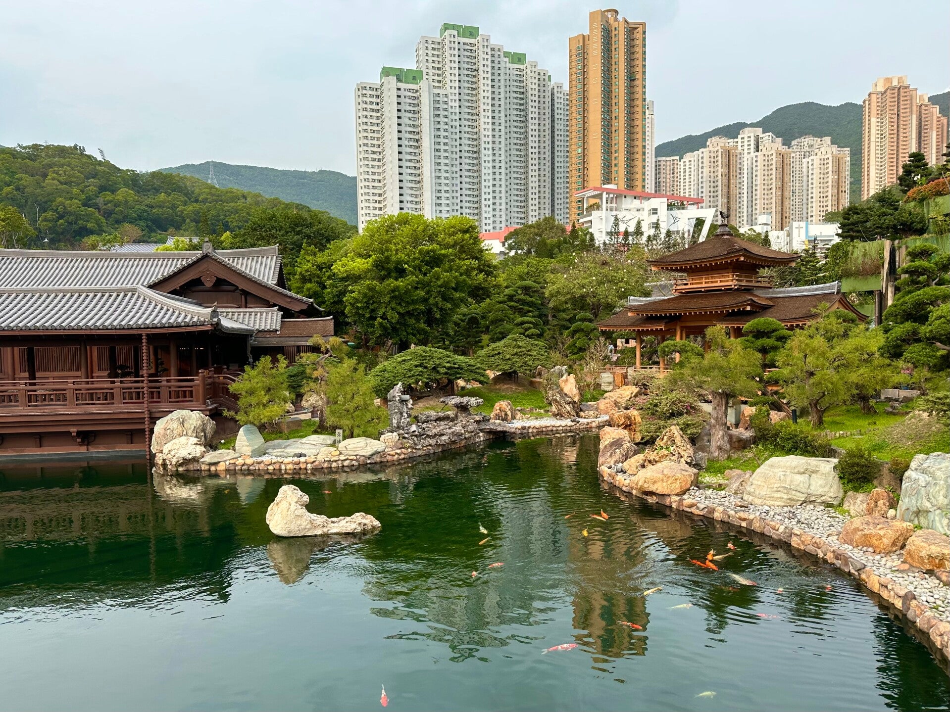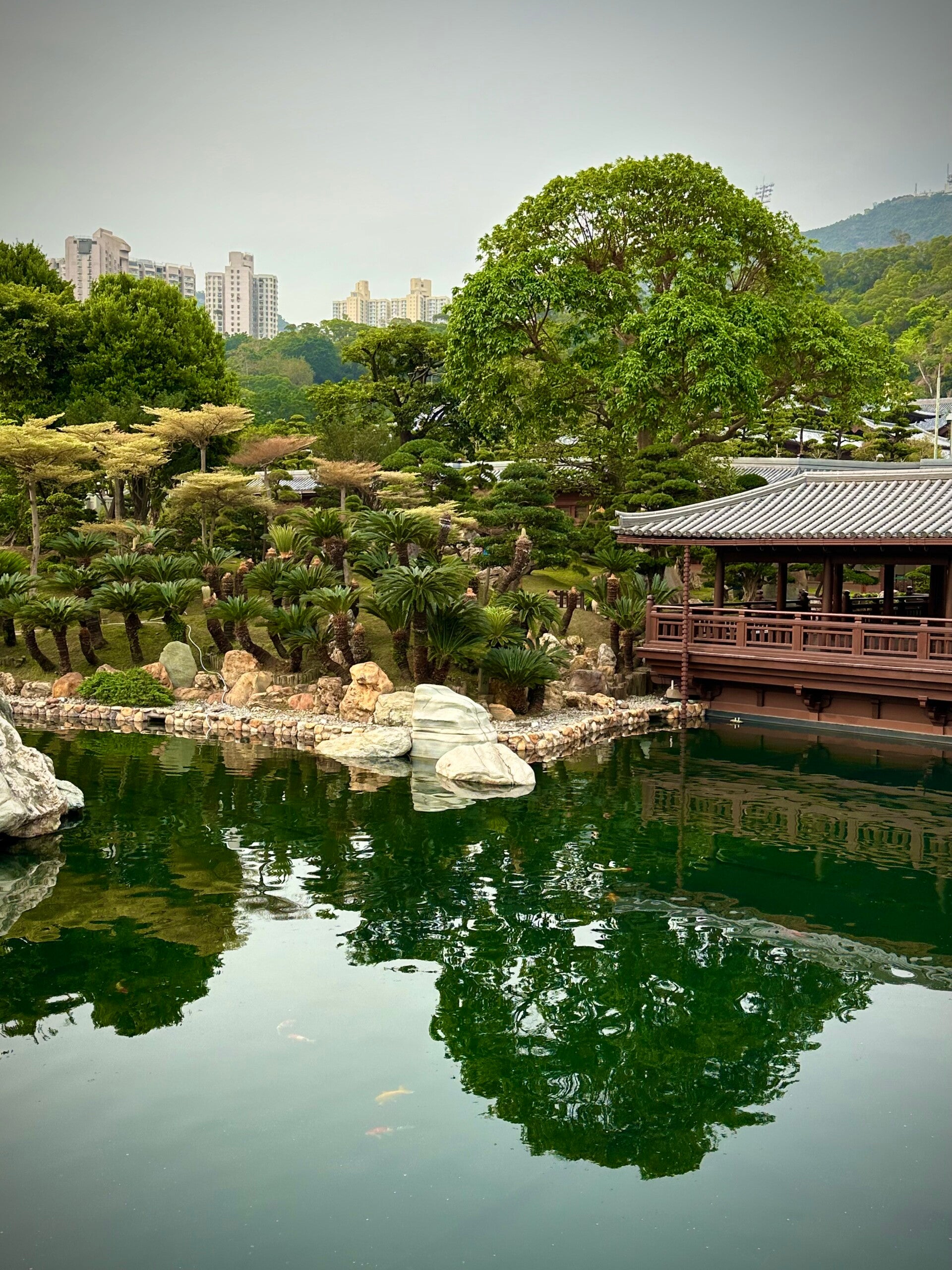 Weiter unten im Garten befindet sich ein großer Teich in dem sich bunte Koi in den schönsten Farben tummeln. Gerade von hier ist der Blick so unglaublich. Solch eine Oase in mitten der hohen Wohntürme. Die Dauerberieselung mit asiatischen Klängen lässt uns die Großstadt aber schnell vergessen, und ein Wohlfühlgefühl und Entspannung stellt sich ein. Im zweiten Teich gelangt man dann über eine orangefarbene gebogene Brücke in den sogenannten Teesaloon.
