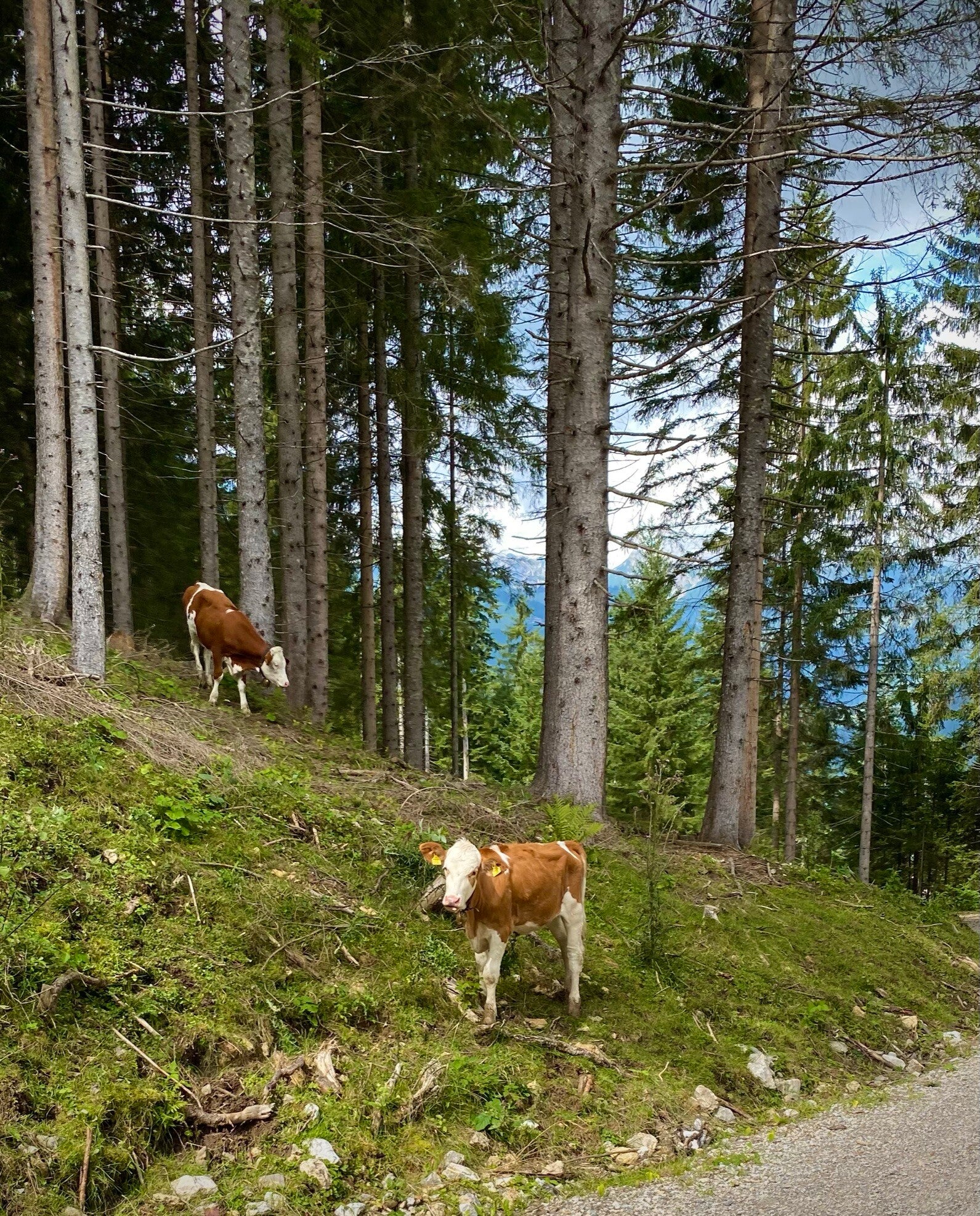 Bis die netten Kühe vor uns aufgetaucht sind. Diese wären kein Problem gewesen, aber nachdem nach der nächsten Kurve eine ganze Herde auf uns zu kam, entschieden wir uns - so wie zwei weitere Päärchen auch - auf den blauen Einser Weg abzubiegen - schwerer Wanderweg.