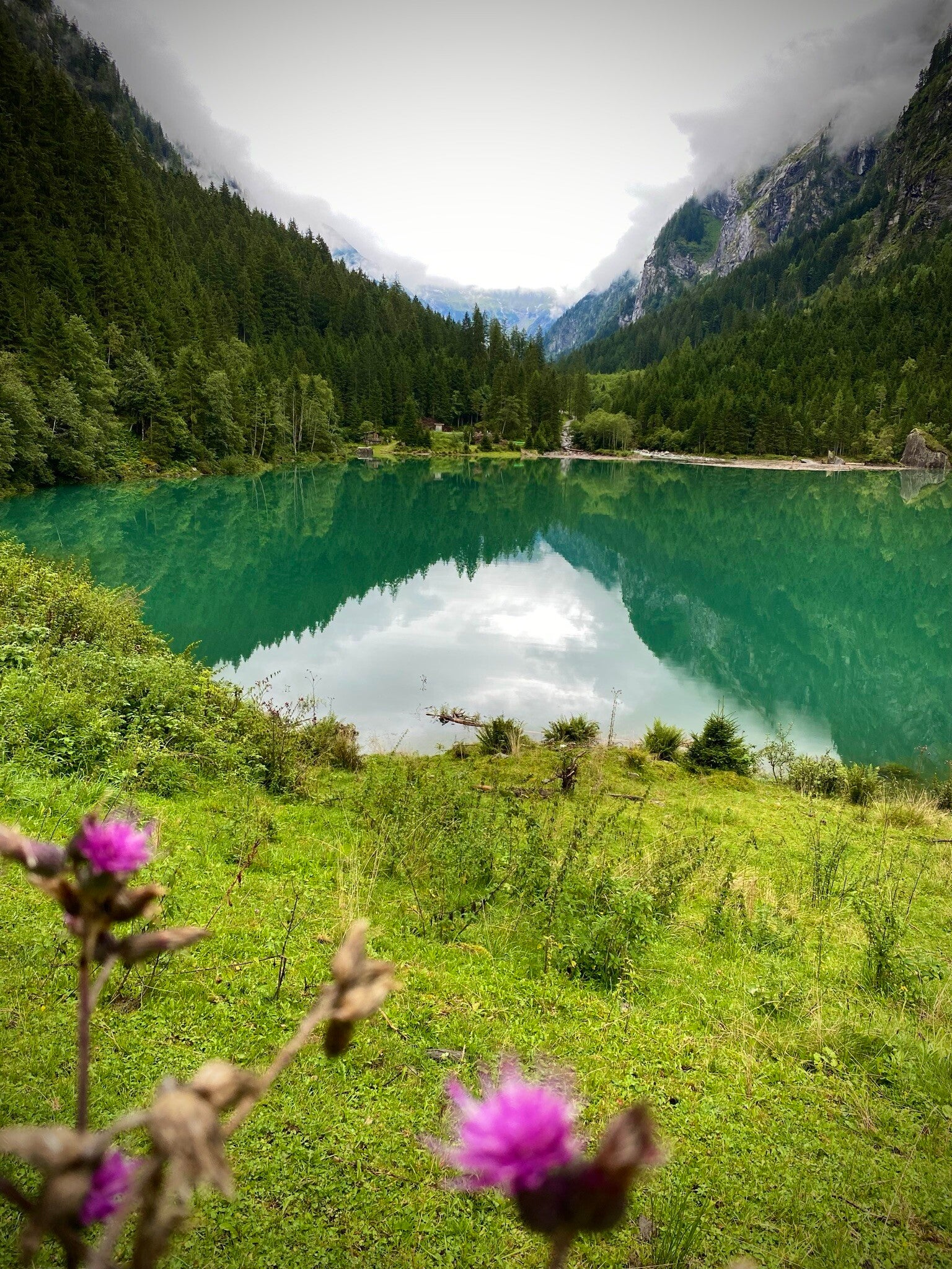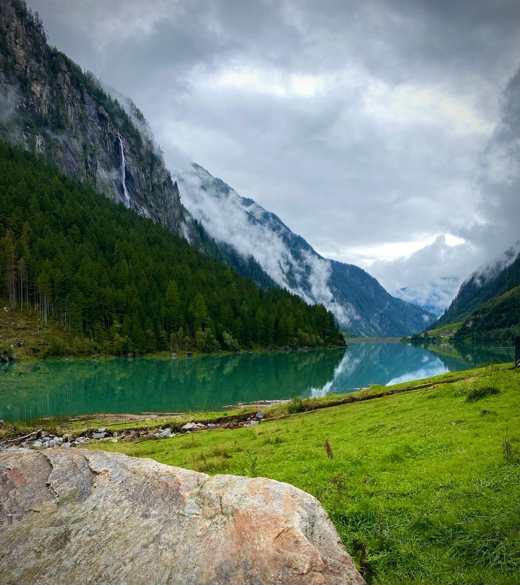Was uns dort erwartete war atemberaubend. Der Anblick der Berge am grünen See beindruckend. Trotz schlechten Wetters, Nieselregen und Kälte haben wir die Wanderschuhe ausgepackt und auf den Weg zum Stillupgasthaus gemacht. Der Weg ging leider komplett über Asphalt, da der neu angelegte Wanderweg zum Teil schon wieder weggespült war. Aber es war herrlich an den vielen Wasserfällen vorbei.