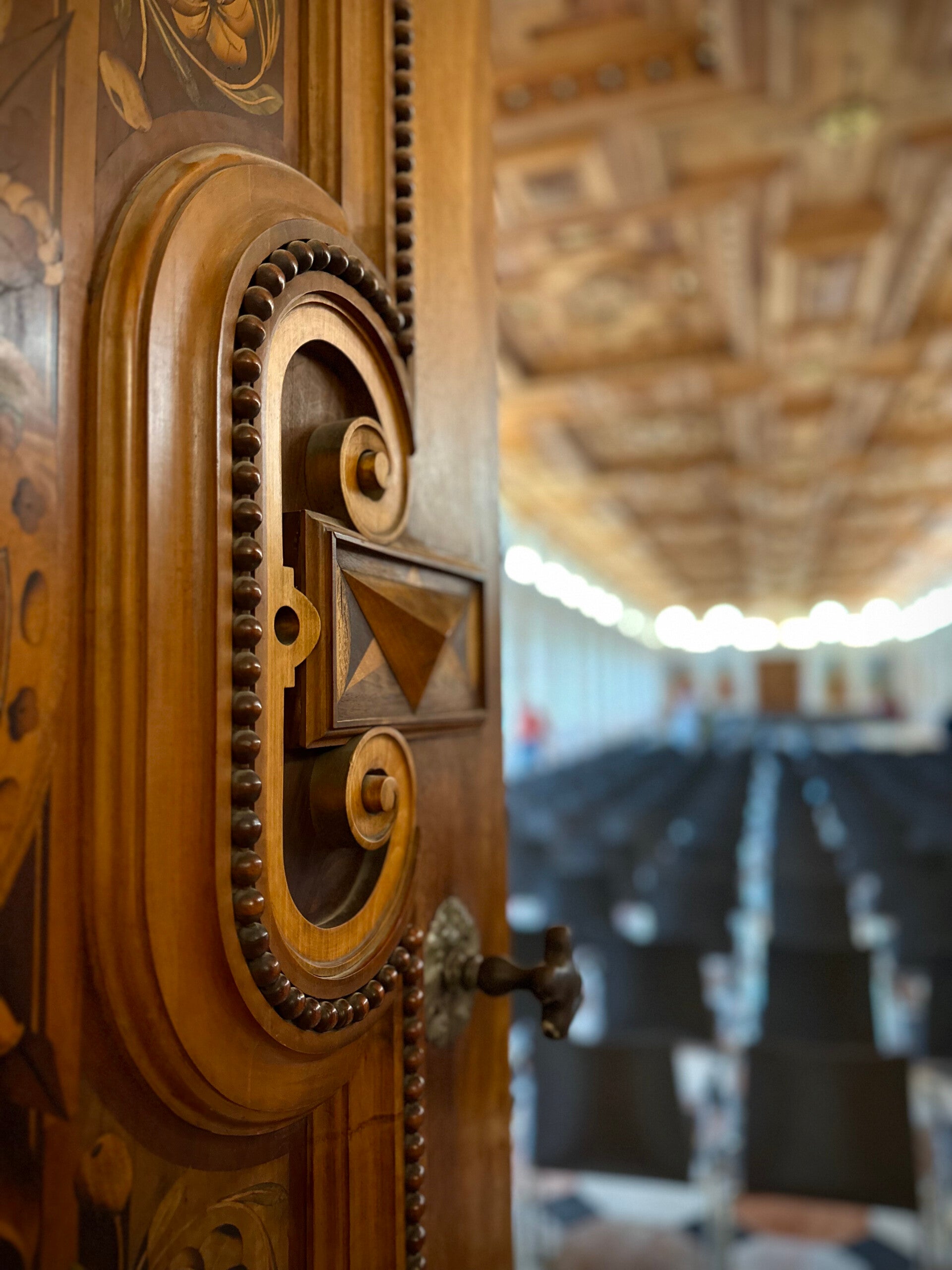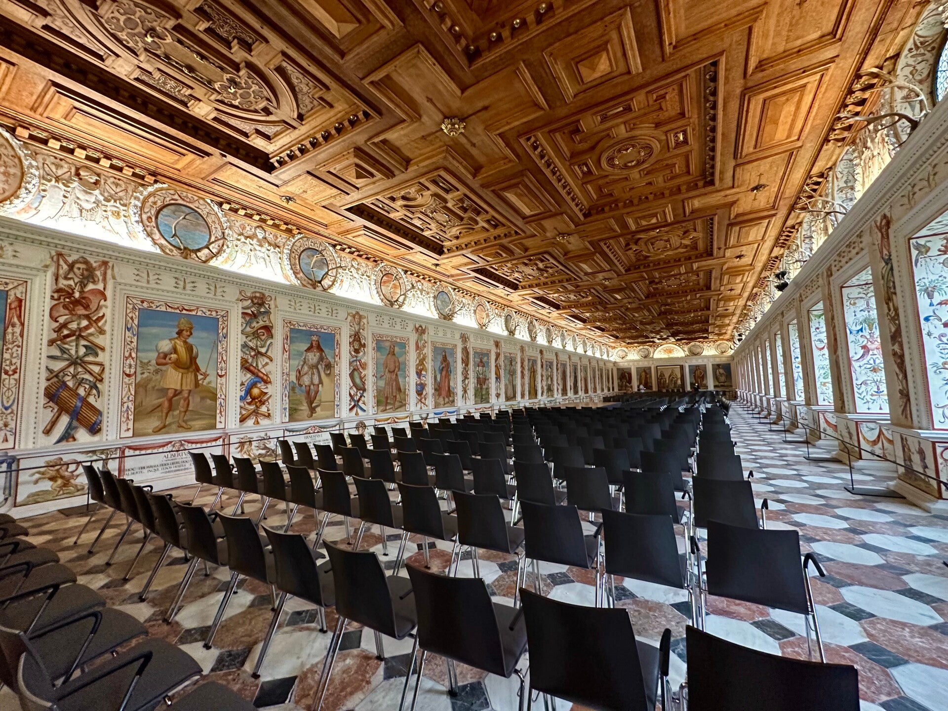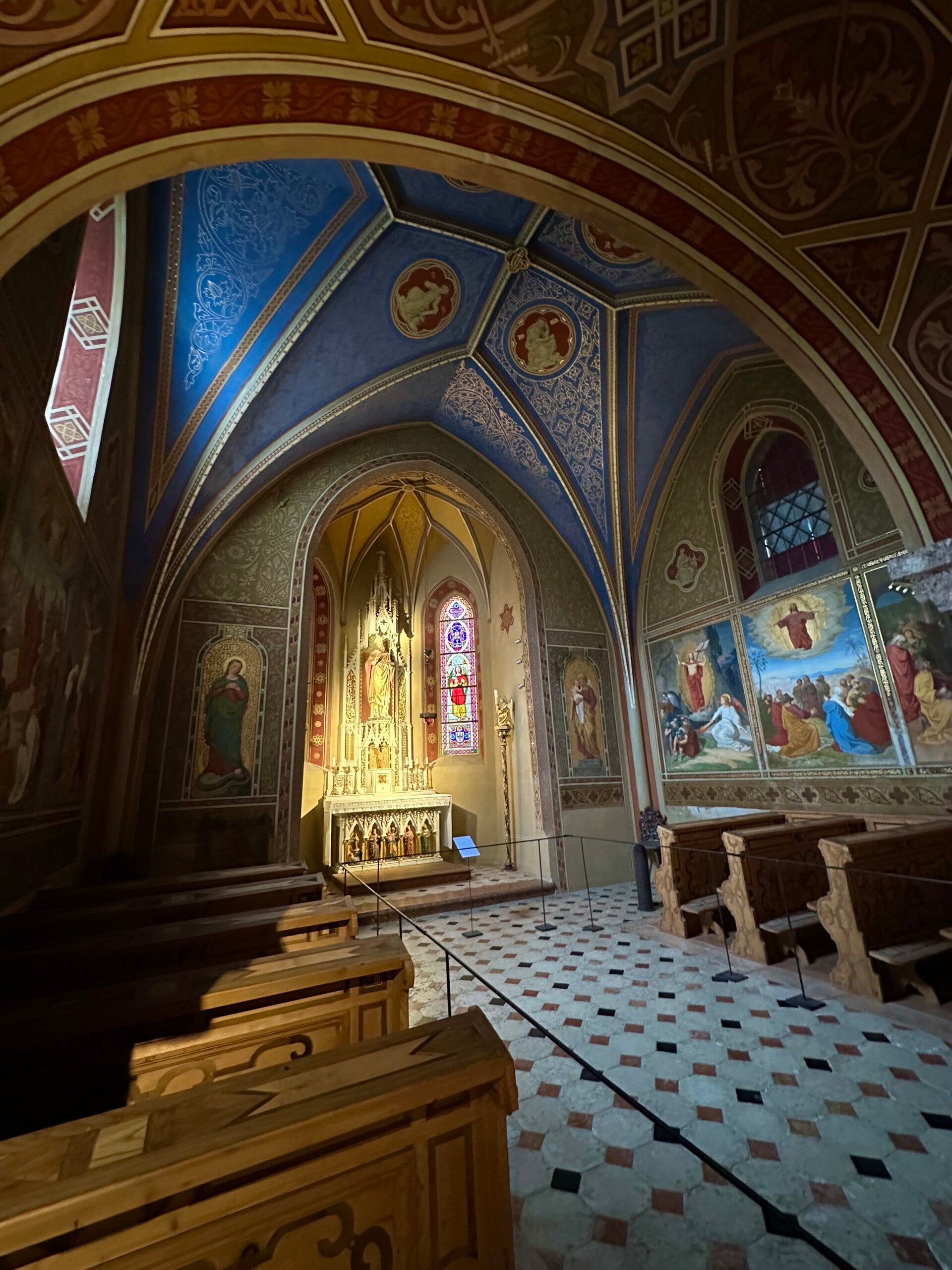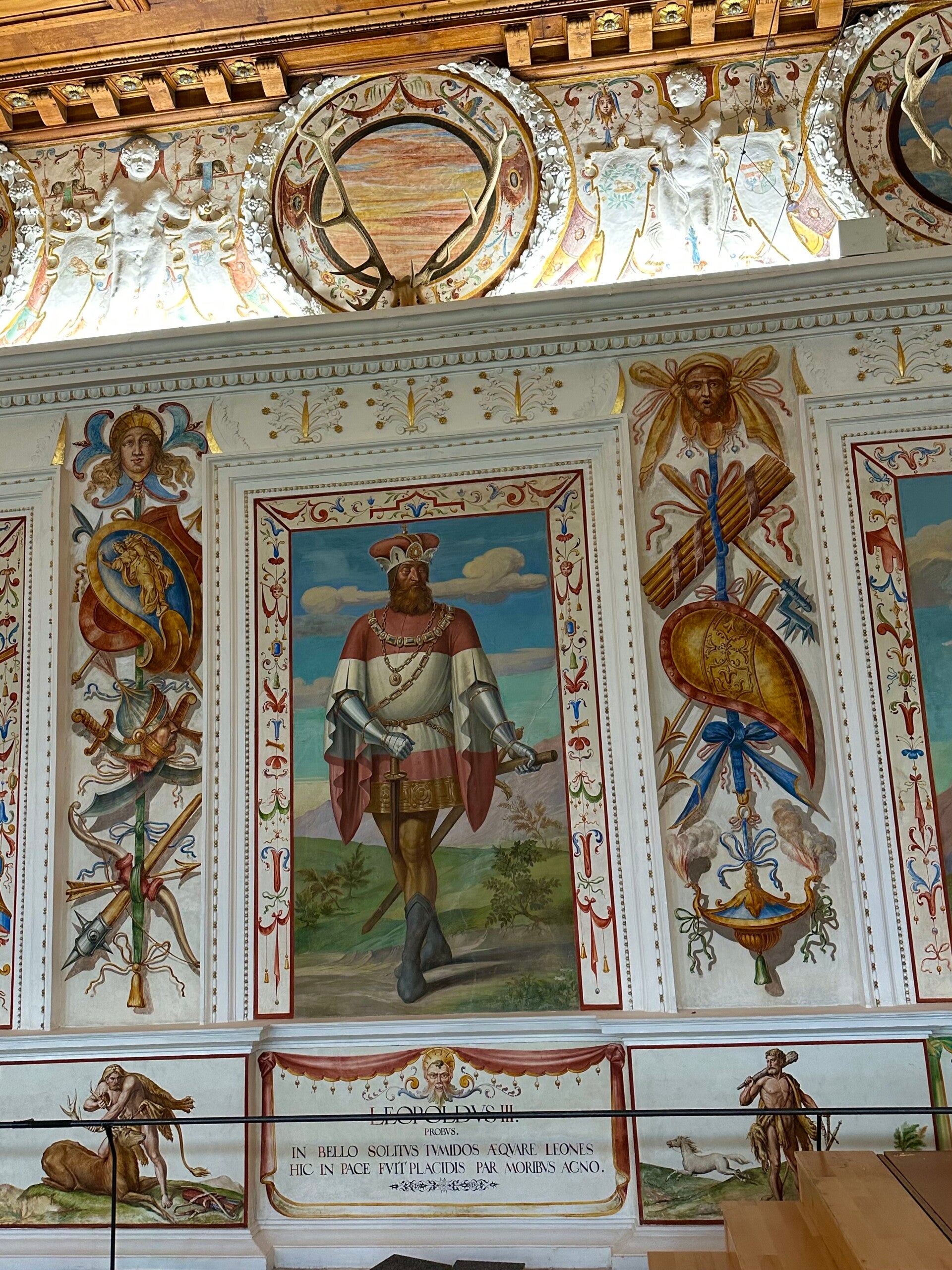 Die intensiven Farben der Wandmalereien im großen Saal sind beeindruckend. Die Holzarbeiten wunderbar erhalten.