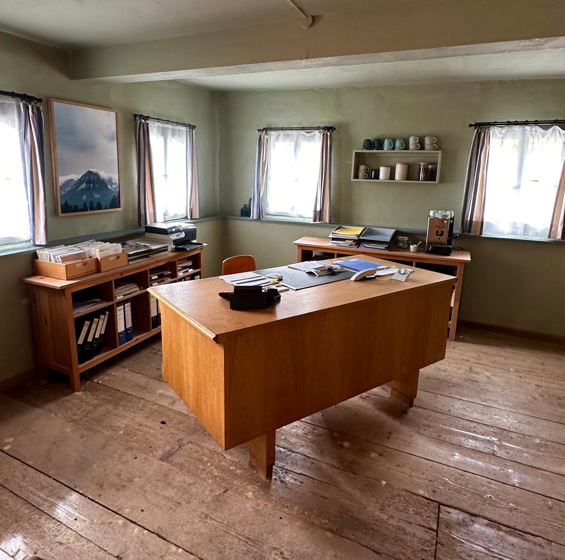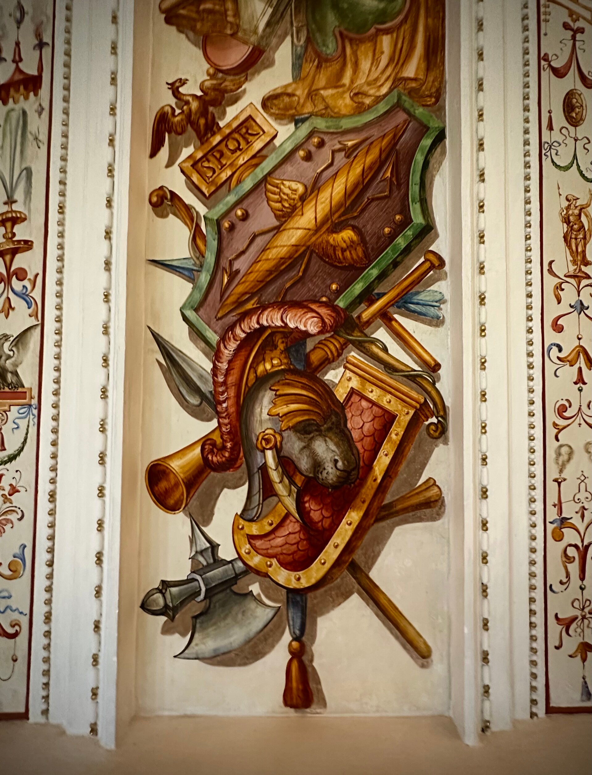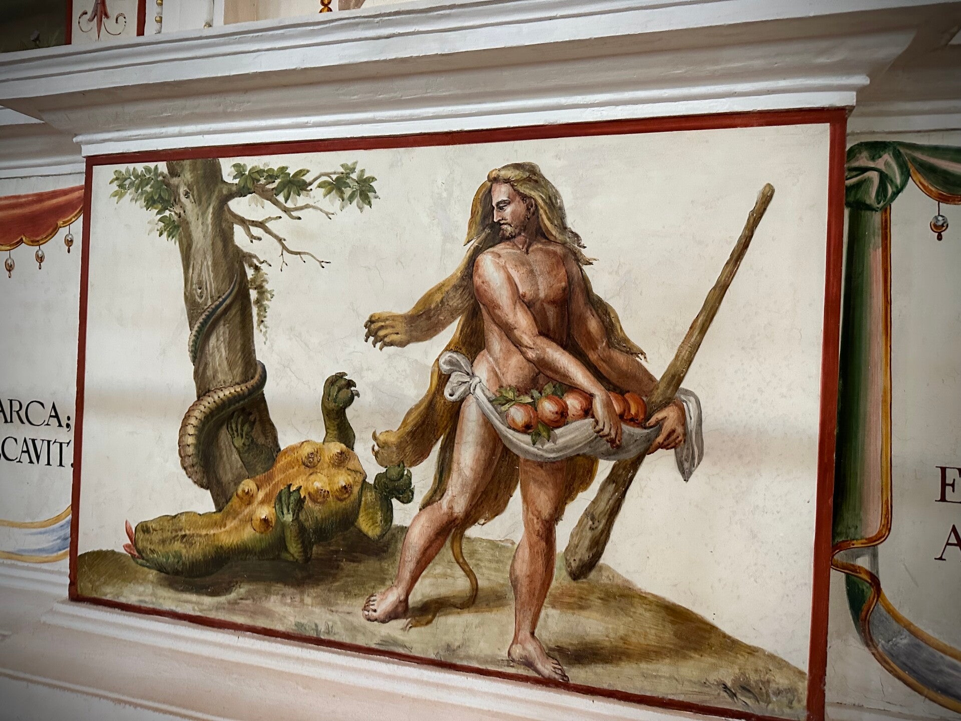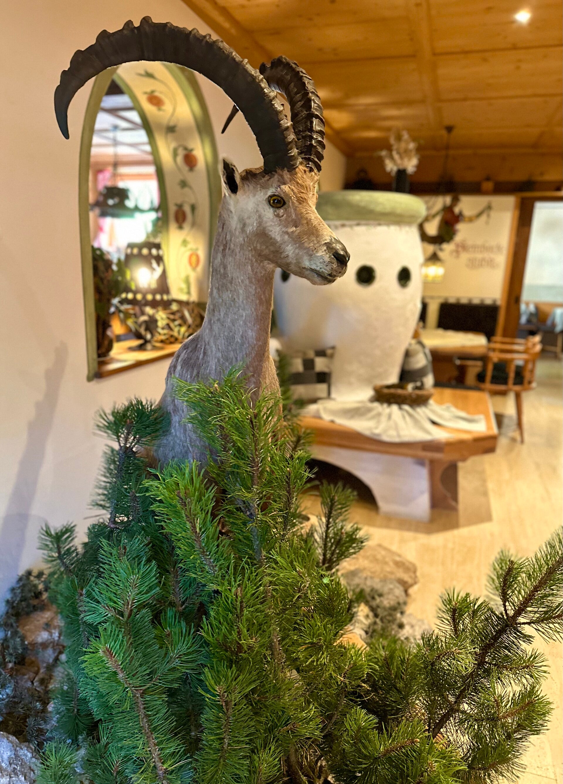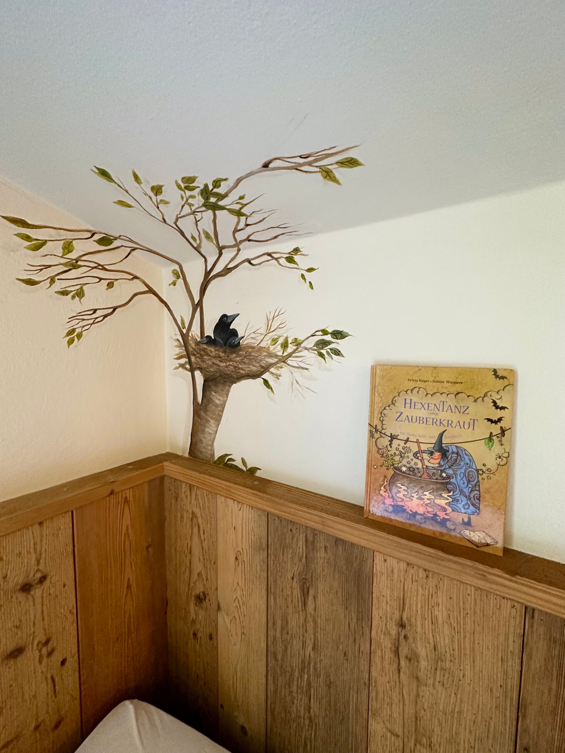Die intensiven Farben der Wandmalereien im großen Saal sind beeindruckend. Die Holzarbeiten wunderbar erhalten.