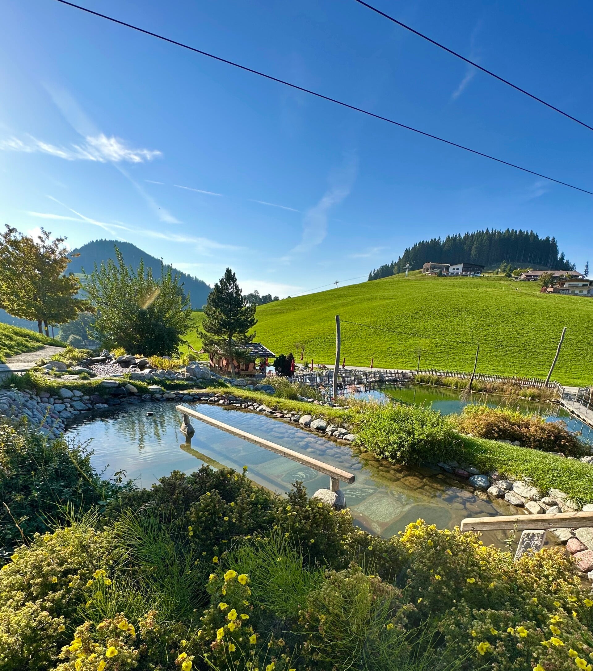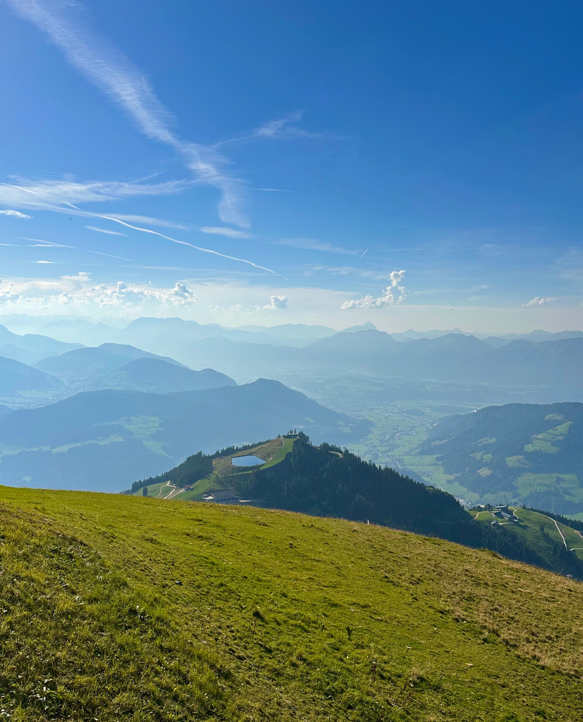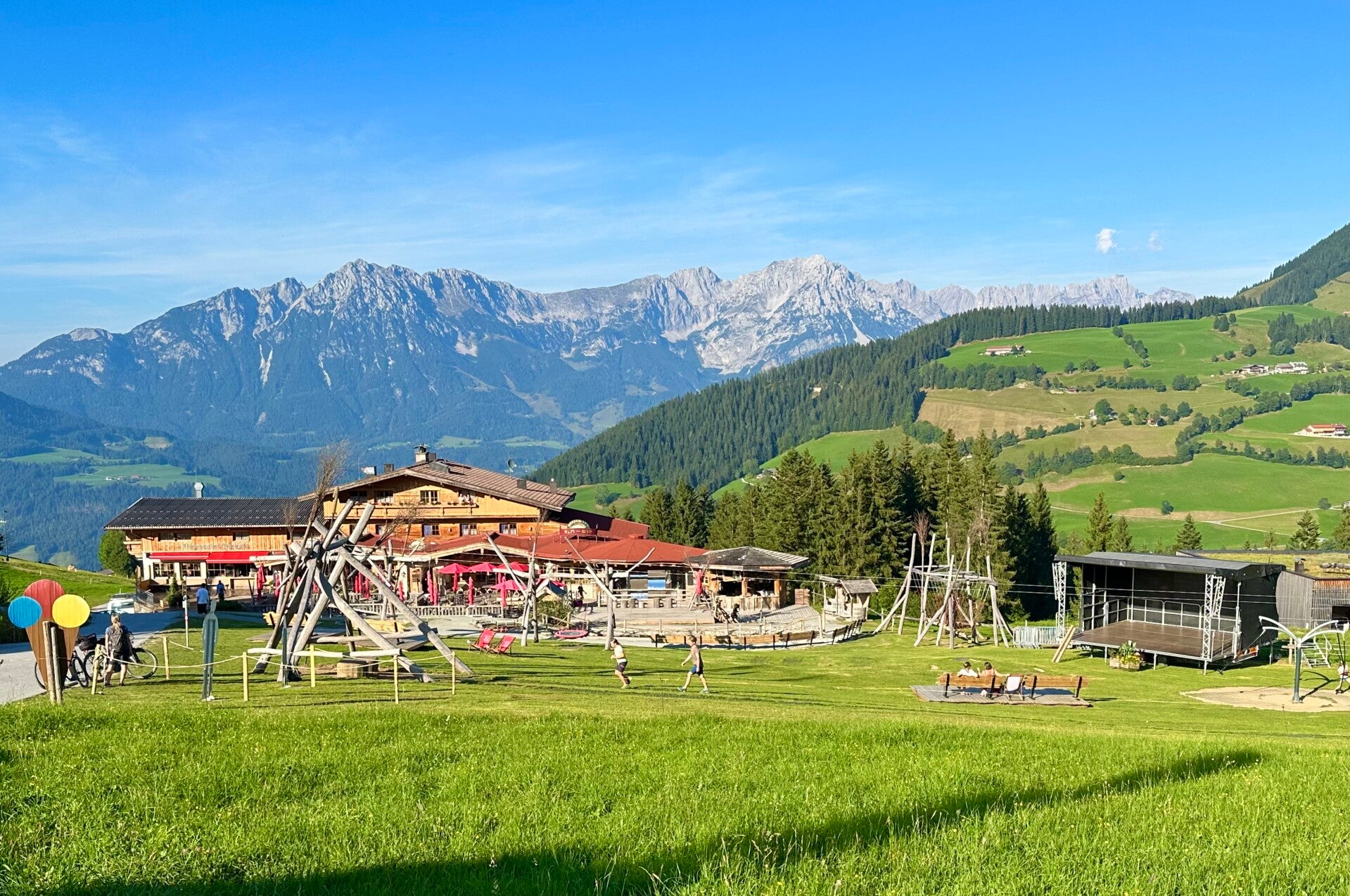 Wir wohnten hier direkt an der Bergstation der Bergbahn aus dem Tal, und daneben die Talstation der Bergbahn zur Hohen Salve. Im Zimmerpreis inkludiert ist die die kostenlose Nutzung aller Bergbahnen im Brixental. Es war später Nachmittag, aber da für den nächsten Tag schlechtes Wetter voraus gesagt war, nutzen wir die Auffahrt auf die Hohe Salve um den Ausblick noch bei Sonnenschein genießen zu können.