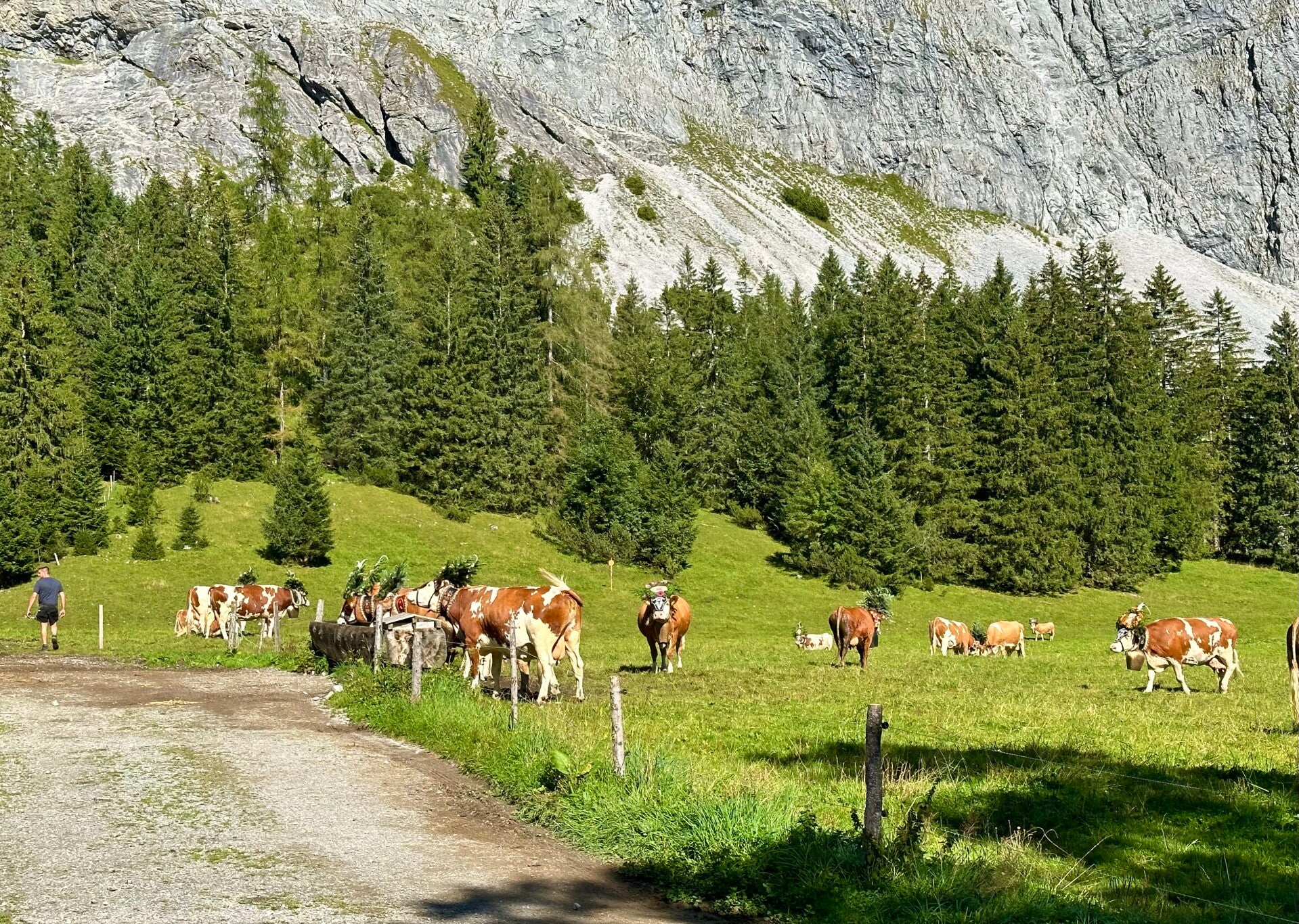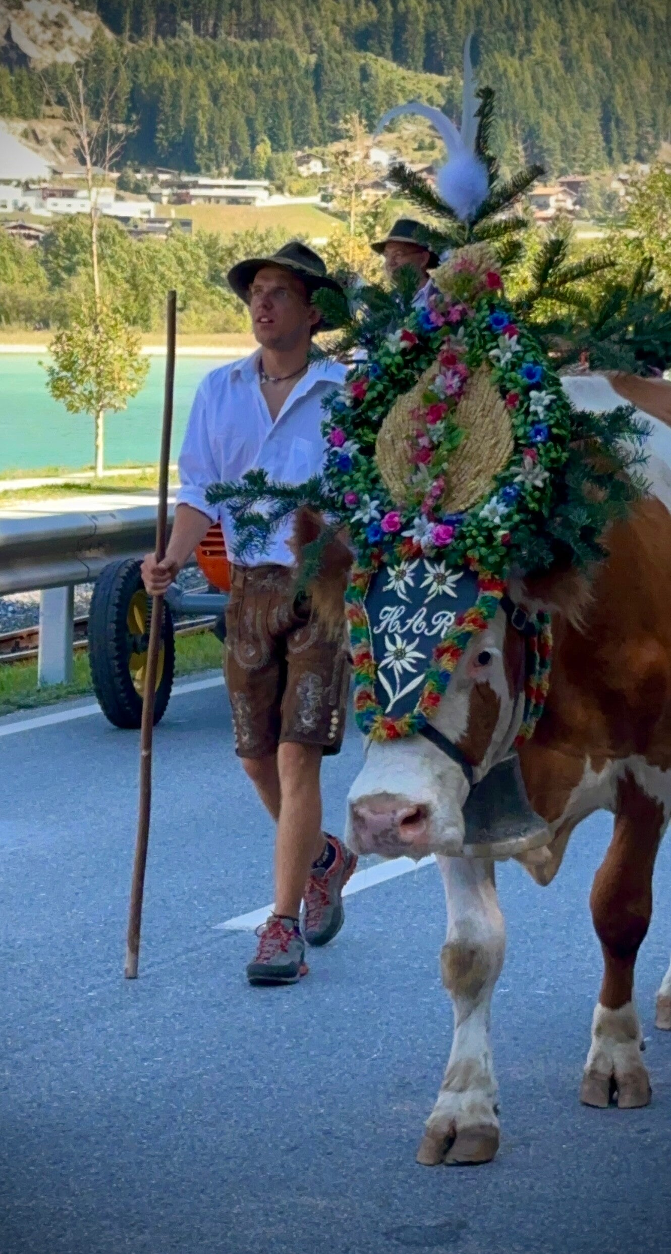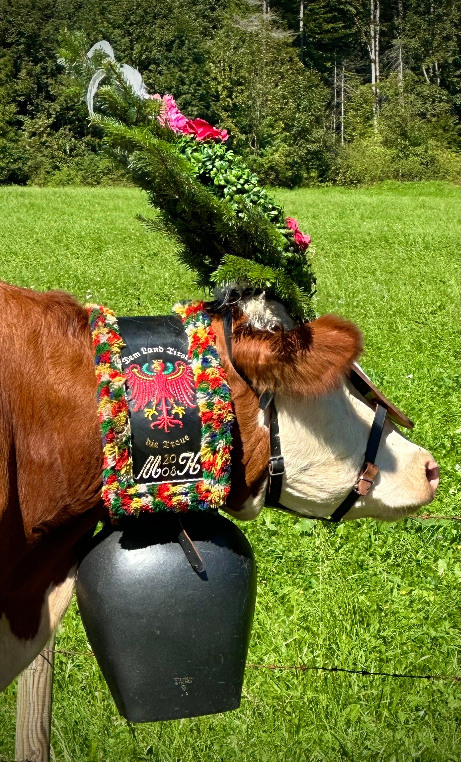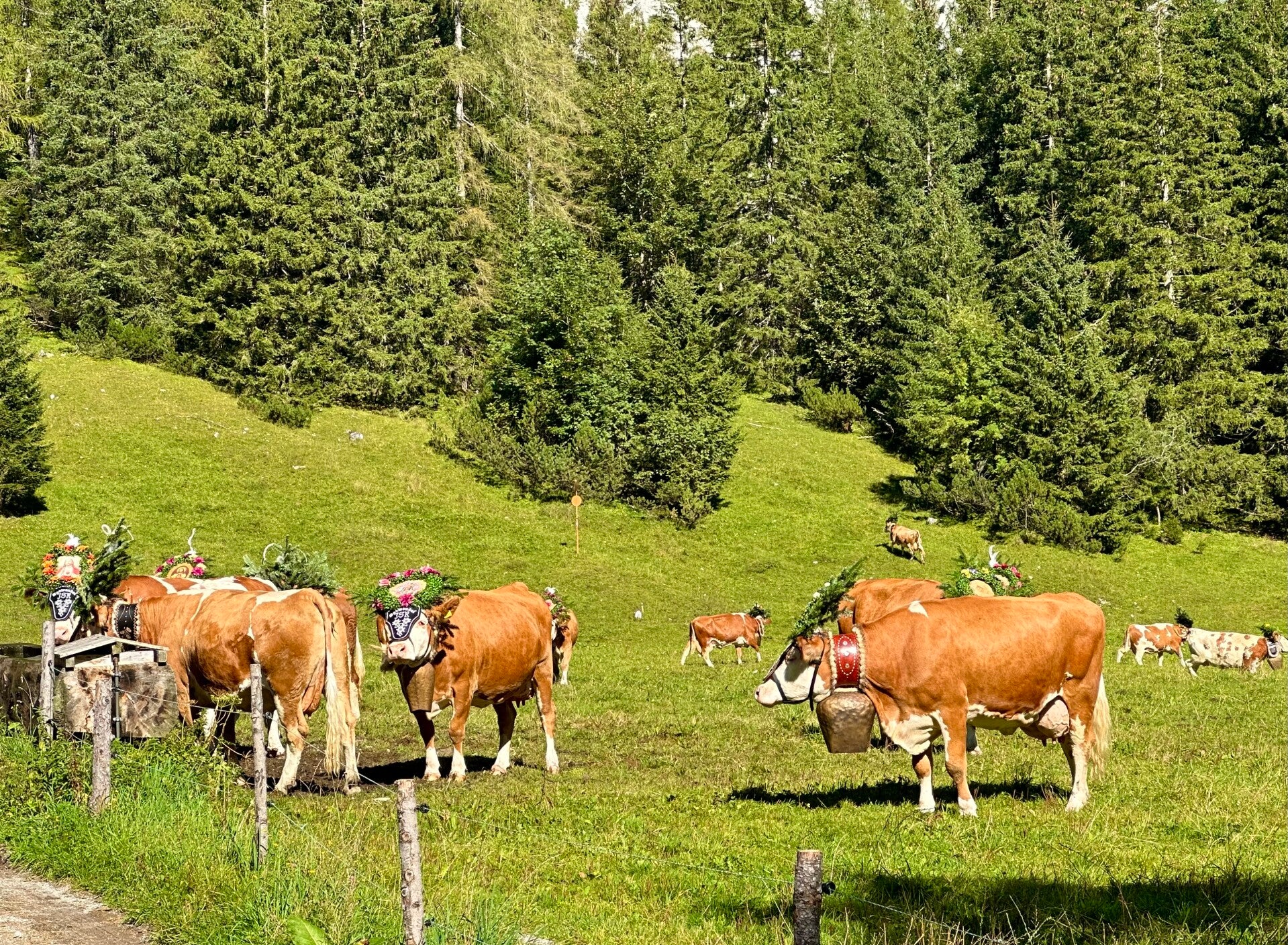 Hier fand ab 11 Uhr das sogenannte „Aufbüscheln“, das Vorbereiten der Kühe für den Almabtrieb, statt. Jede Kuh bekam ihre Glocke und den obligatorischen Kopfschmuck. Danach ging es erstmal auf die Koppel zum austoben, bevor der Marsch Richtung Pertisau begann.