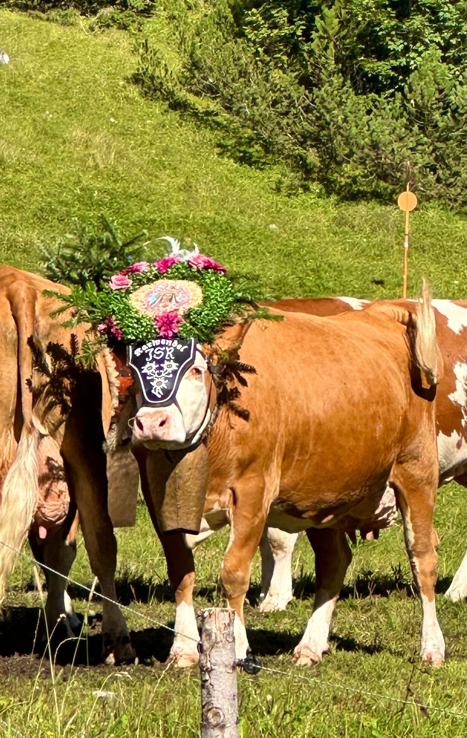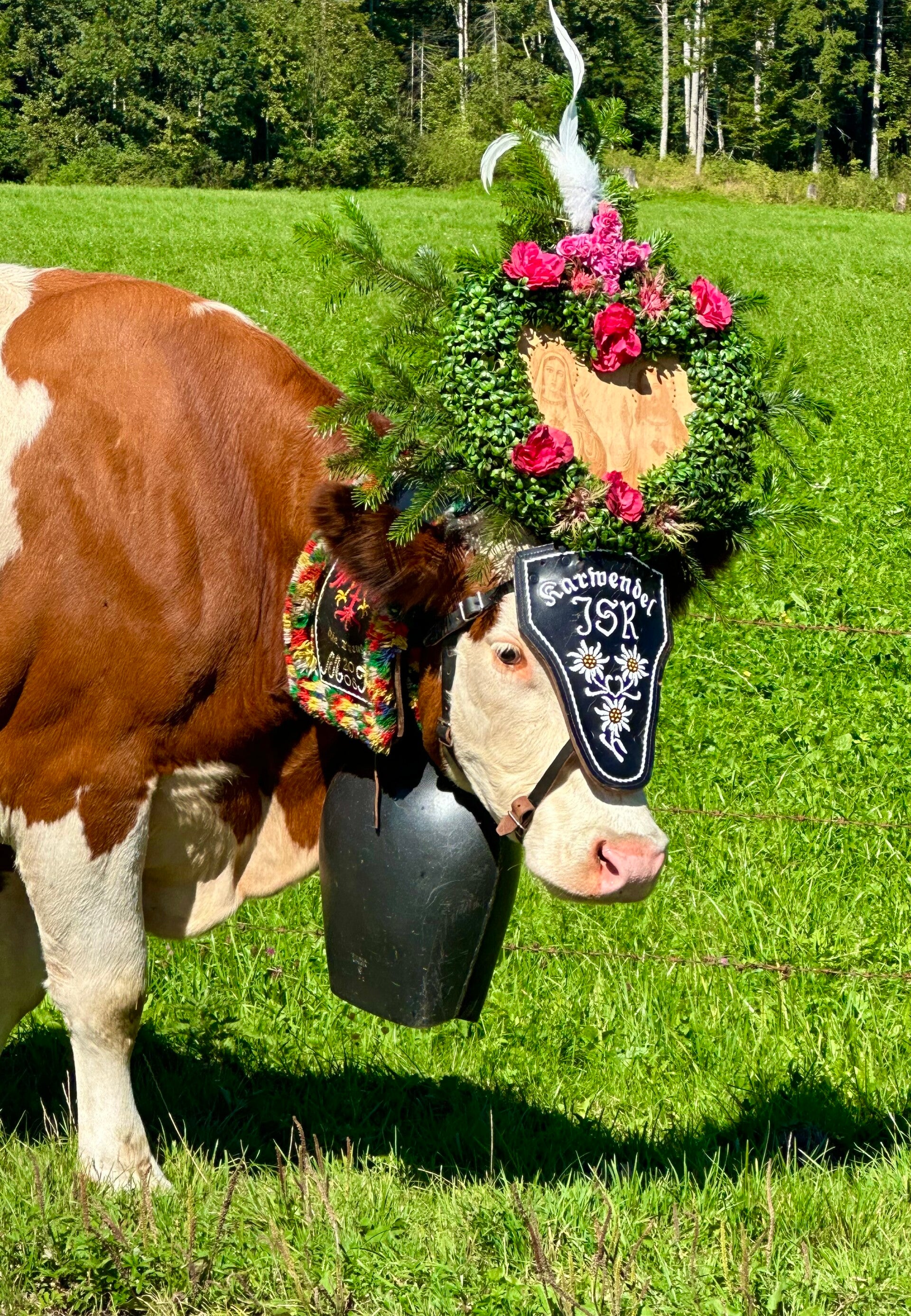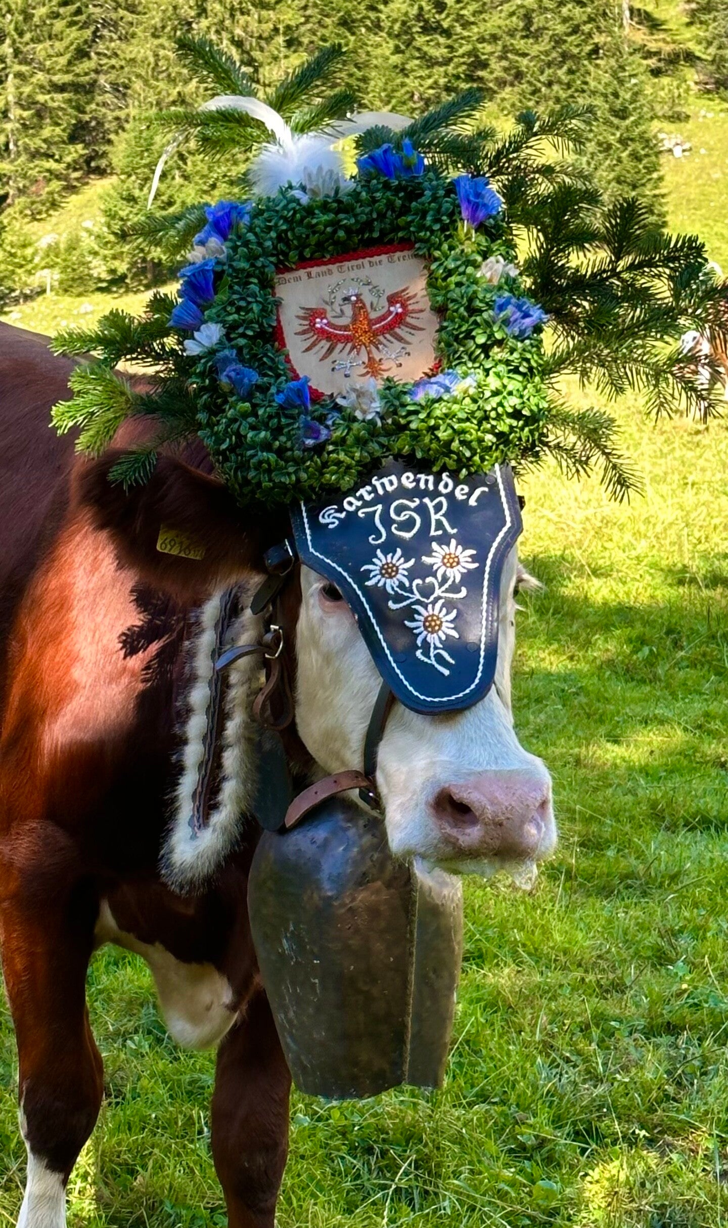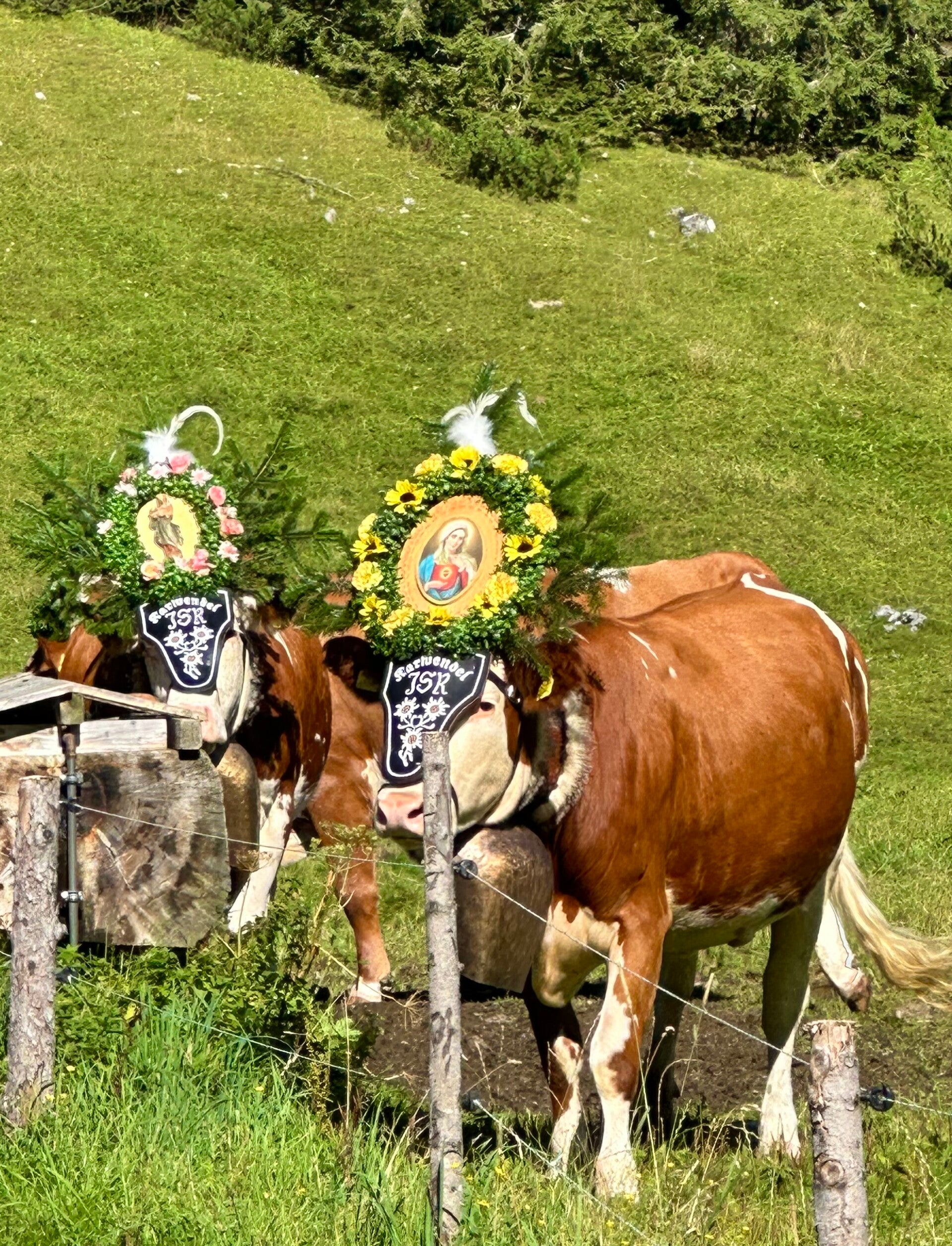 Hier fand ab 11 Uhr das sogenannte „Aufbüscheln“, das Vorbereiten der Kühe für den Almabtrieb, statt. Jede Kuh bekam ihre Glocke und den obligatorischen Kopfschmuck. Danach ging es erstmal auf die Koppel zum austoben, bevor der Marsch Richtung Pertisau begann.