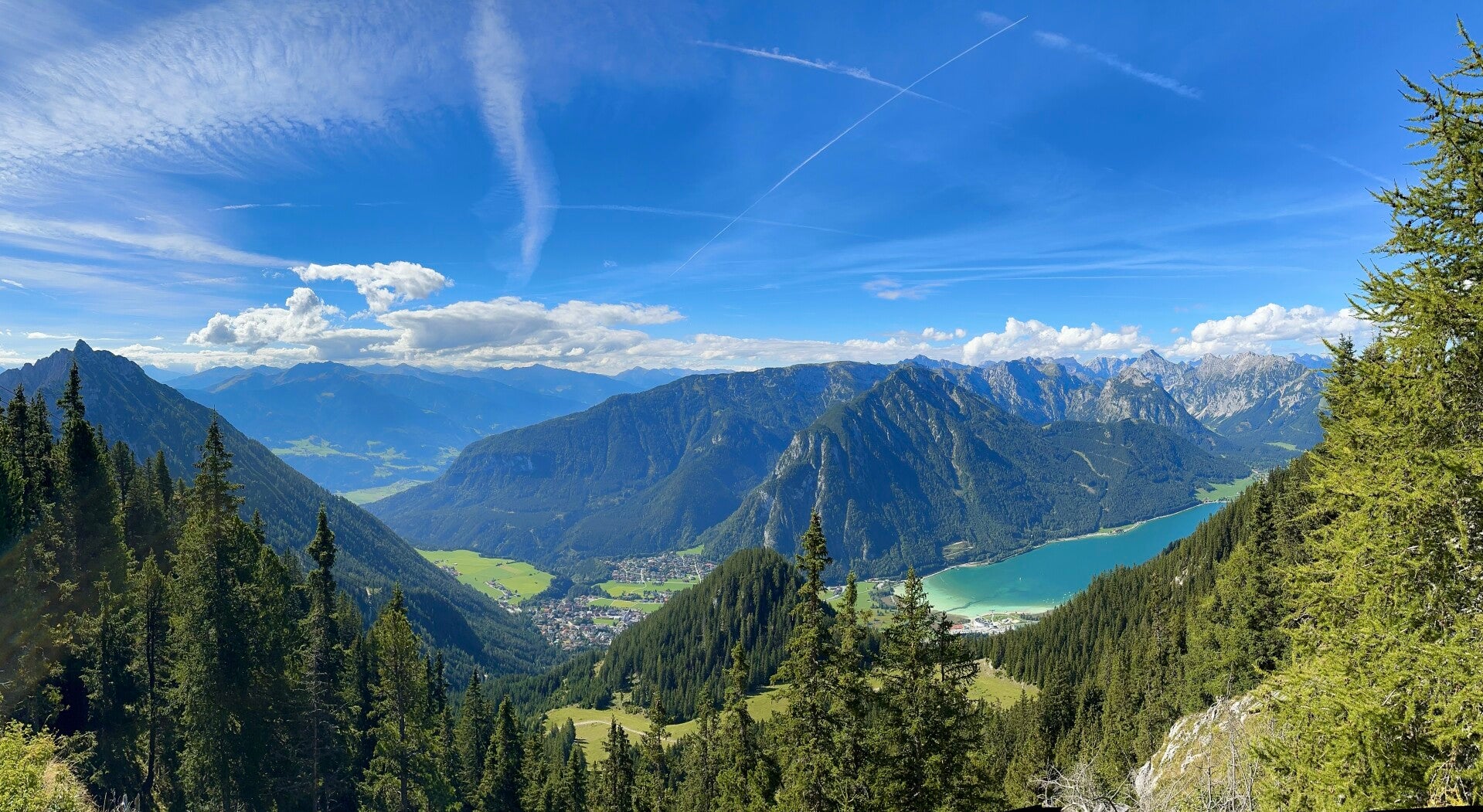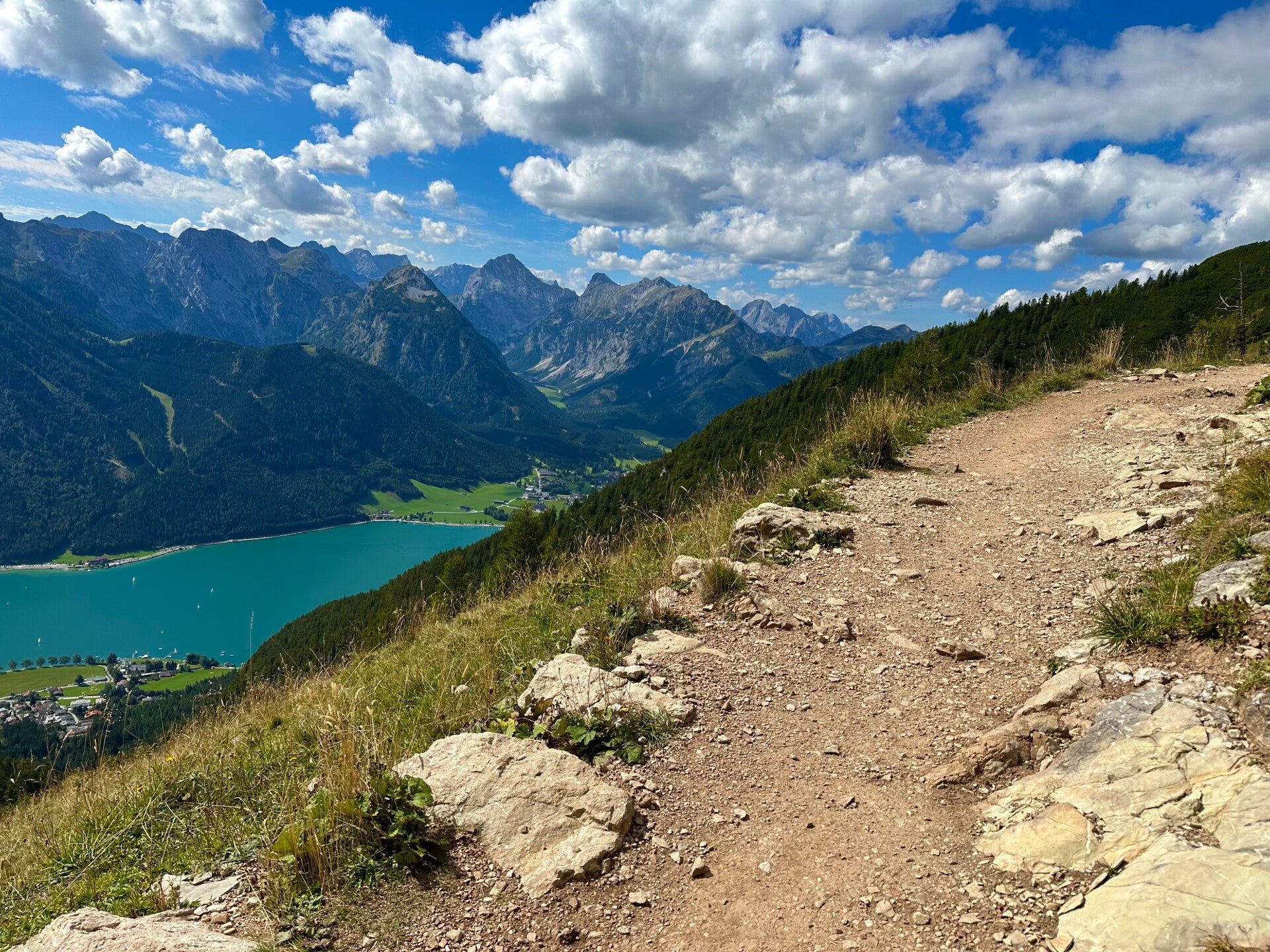 Links war unser Plan für heute. Nach der Auffahrt (rechts im Bild) genossen wir auf der Aussichtsterrasse der Erfurter Hütte bei einer kleinen Erfrischung erstmal die grandiose Aussicht auf den See. Die Hütte liegt direkt an der Bergstation der Rofan Seilbahn, und thront in herrlicher Aussichtslage auf 1831m auf dem Mauritzköpfle. Hier könnte man stundenlang verweilen und den Anblick genießen.