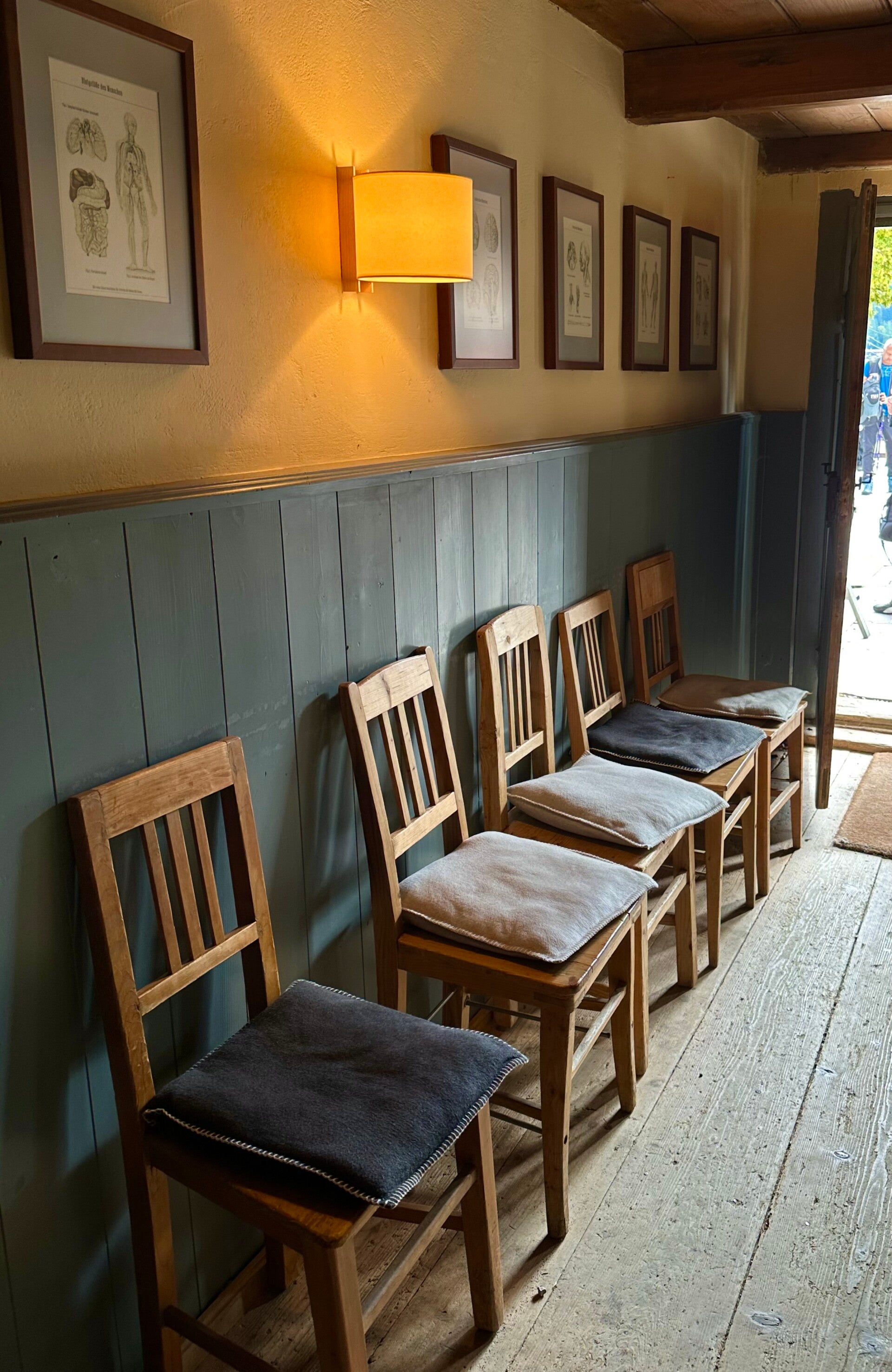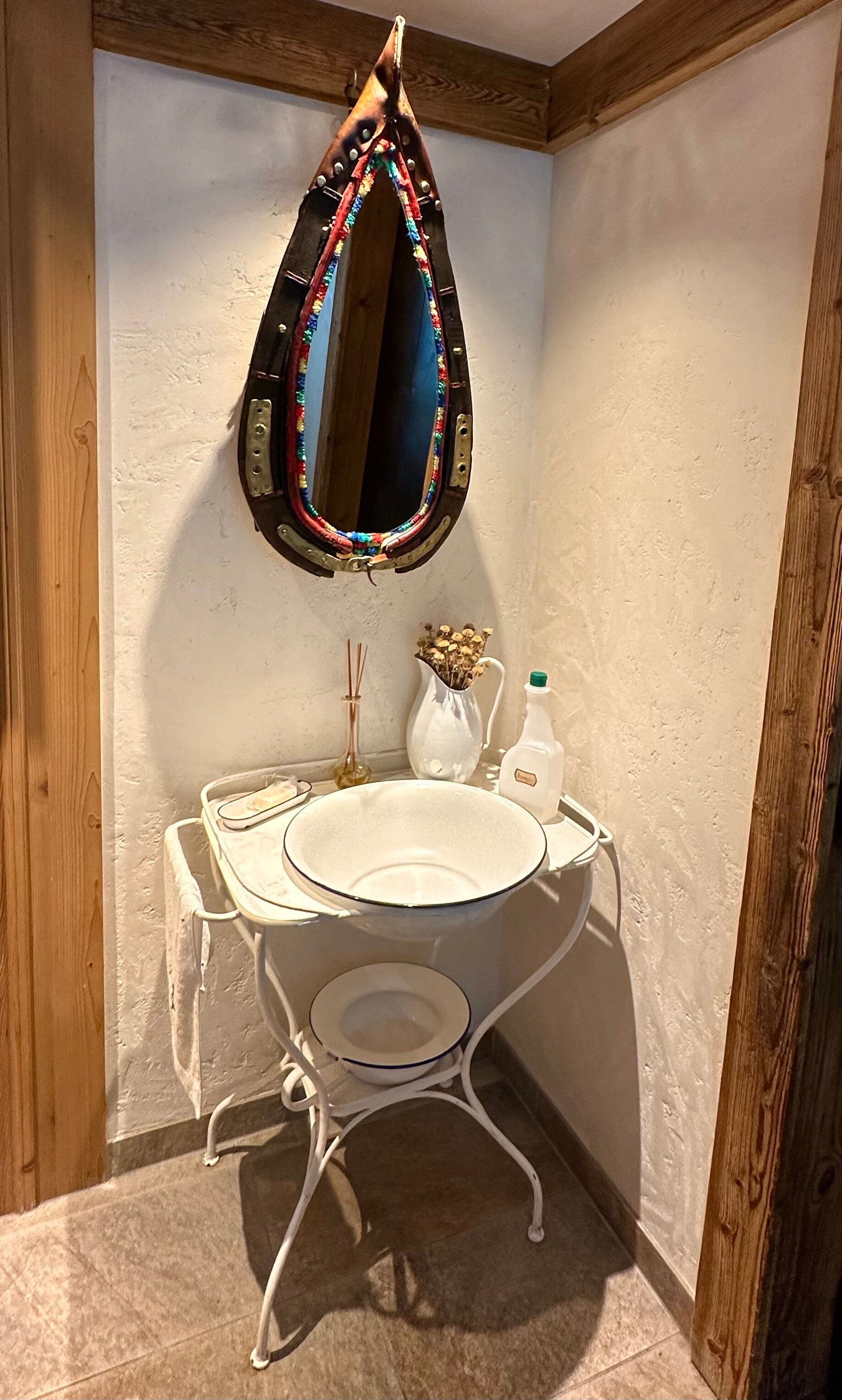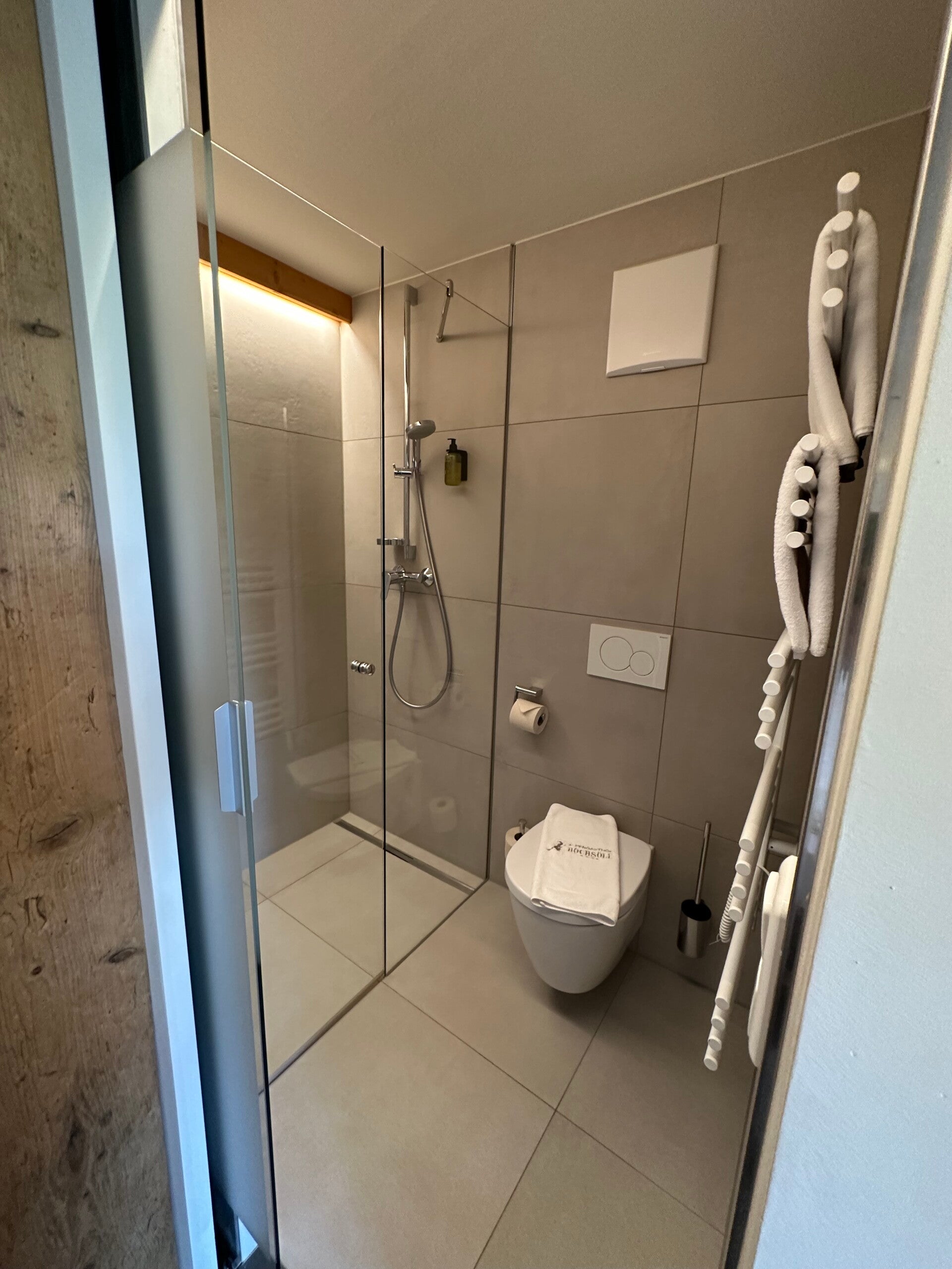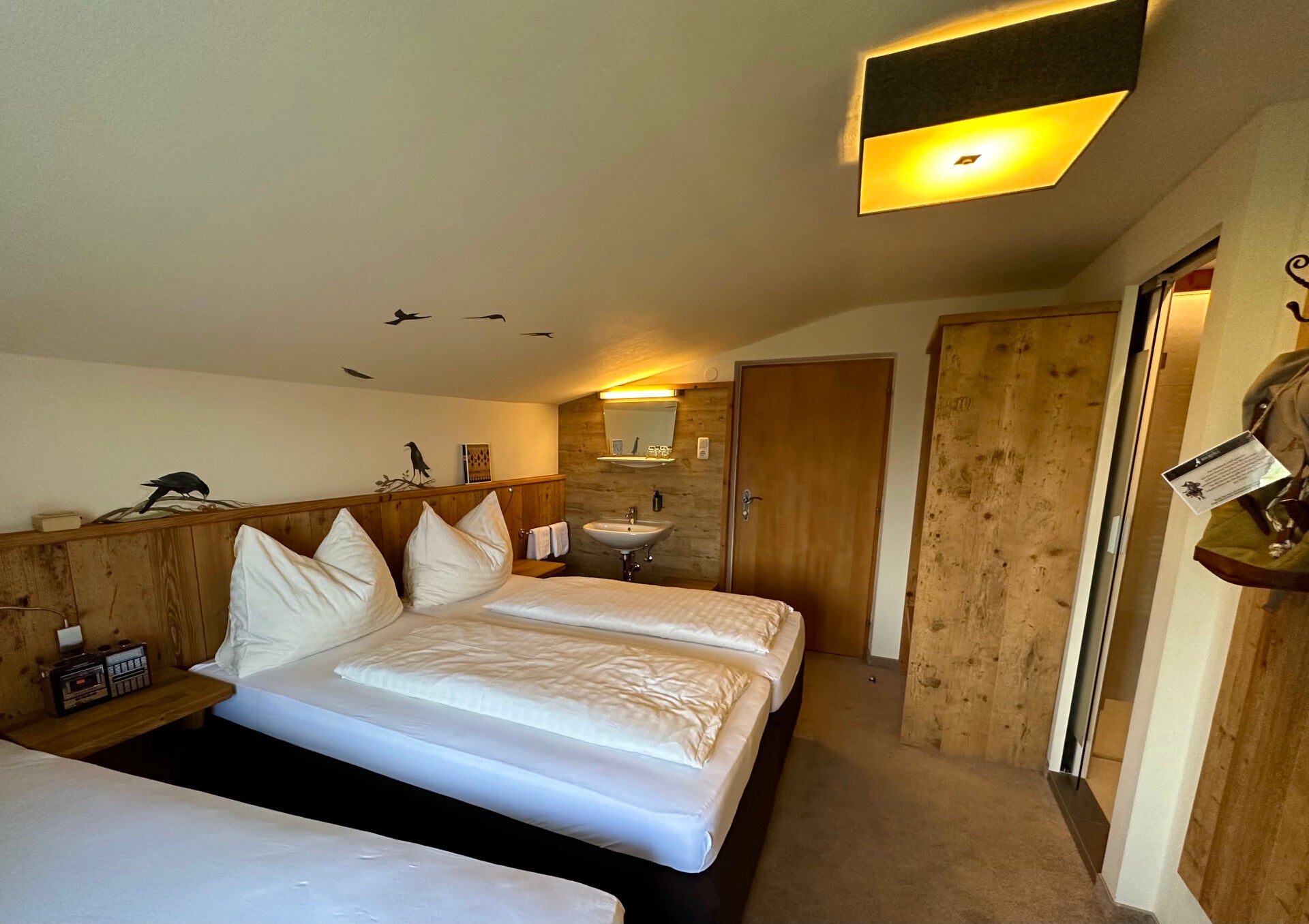 Unsere „Dachkammer“ war urgemütlich, das Waschbecken zwar im Zimmer, aber die Dusche super modern und sauber.