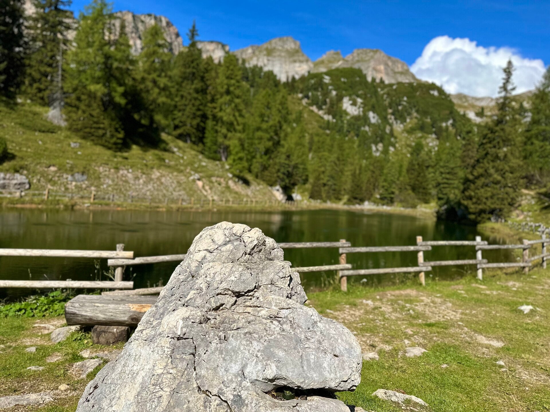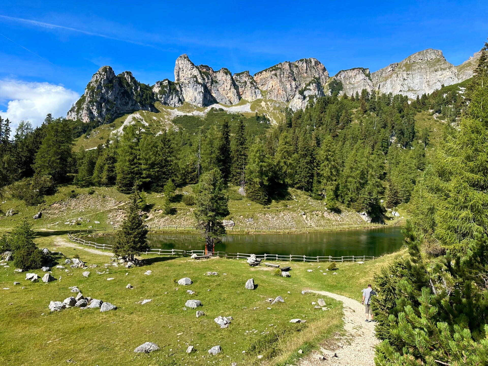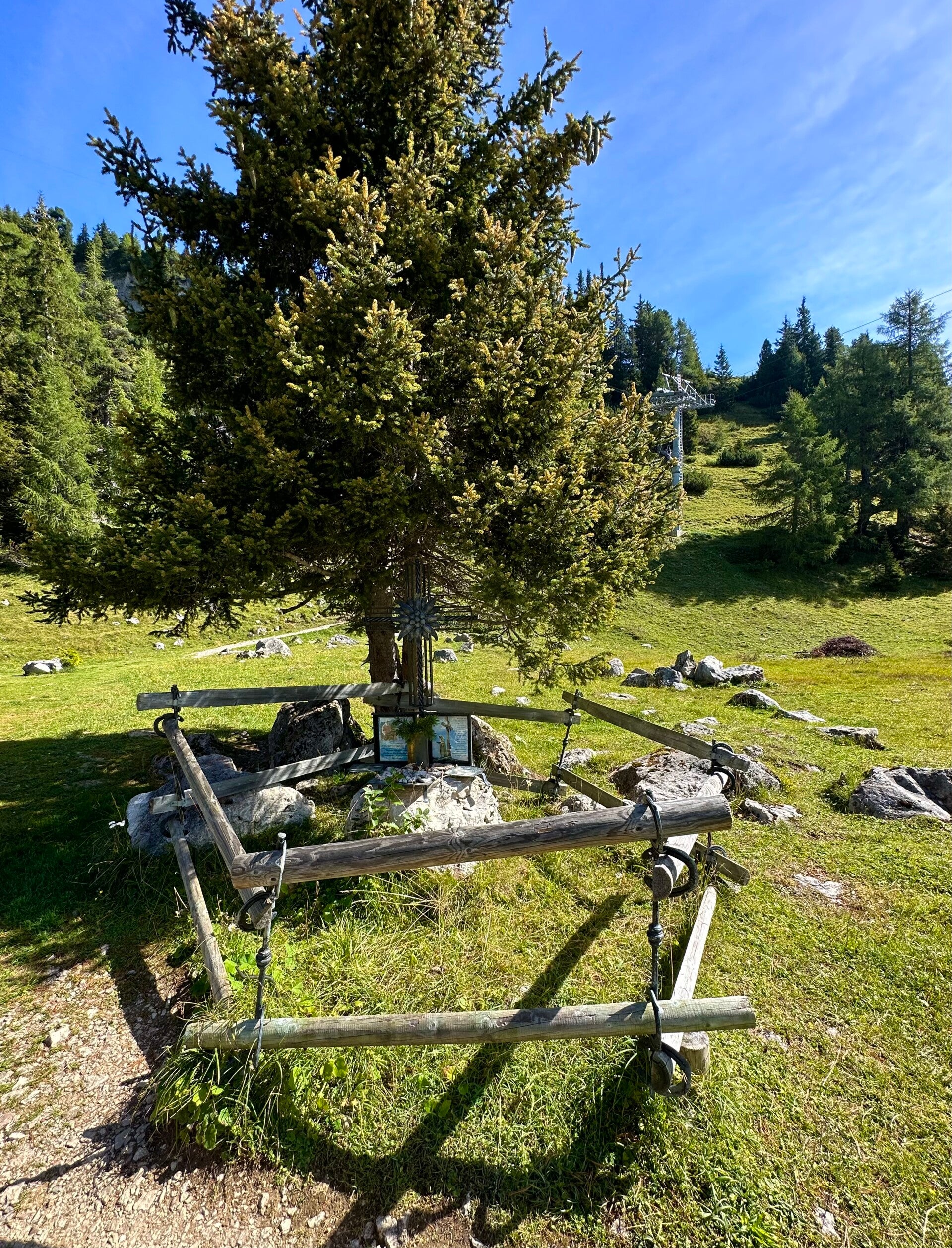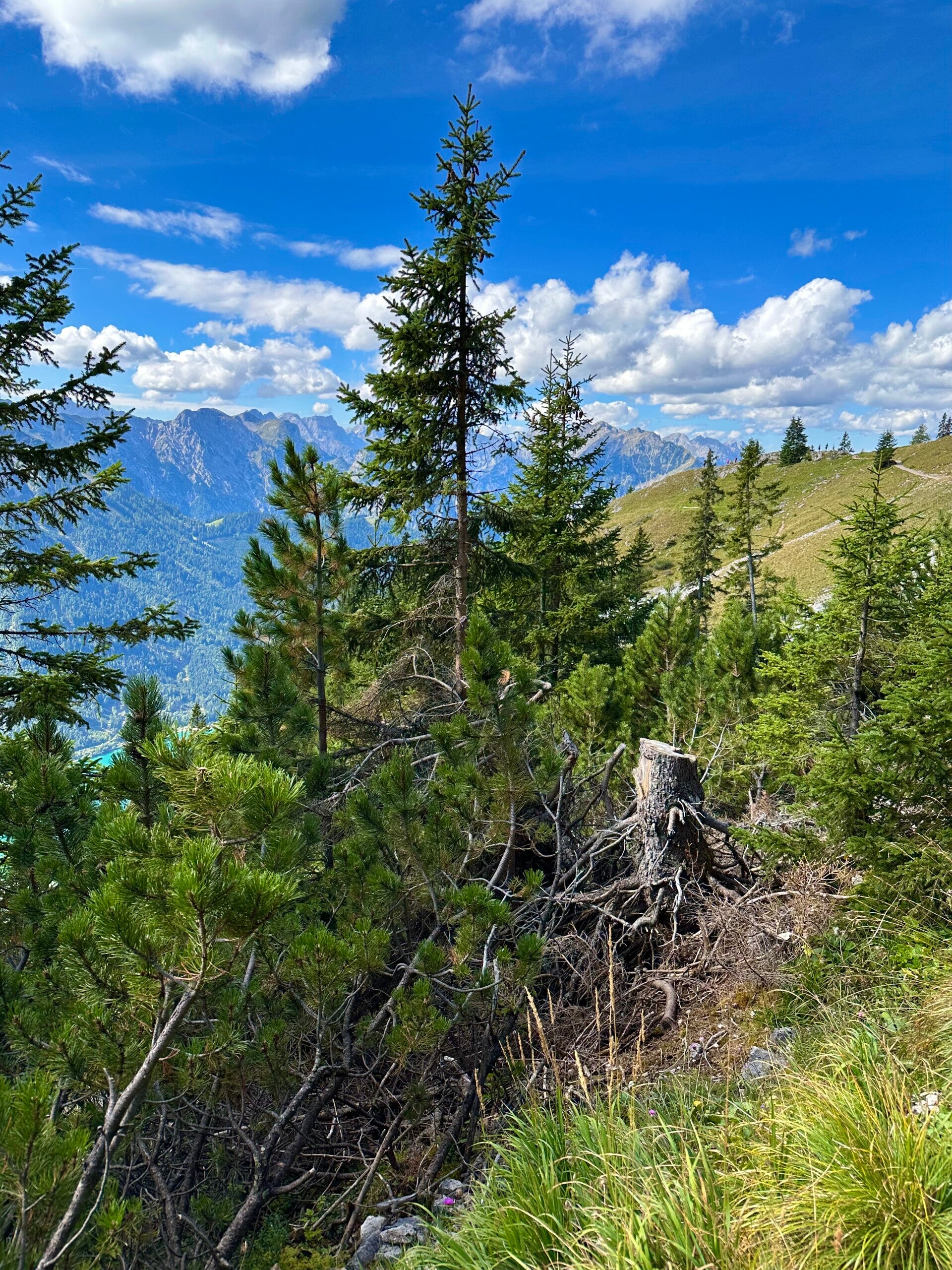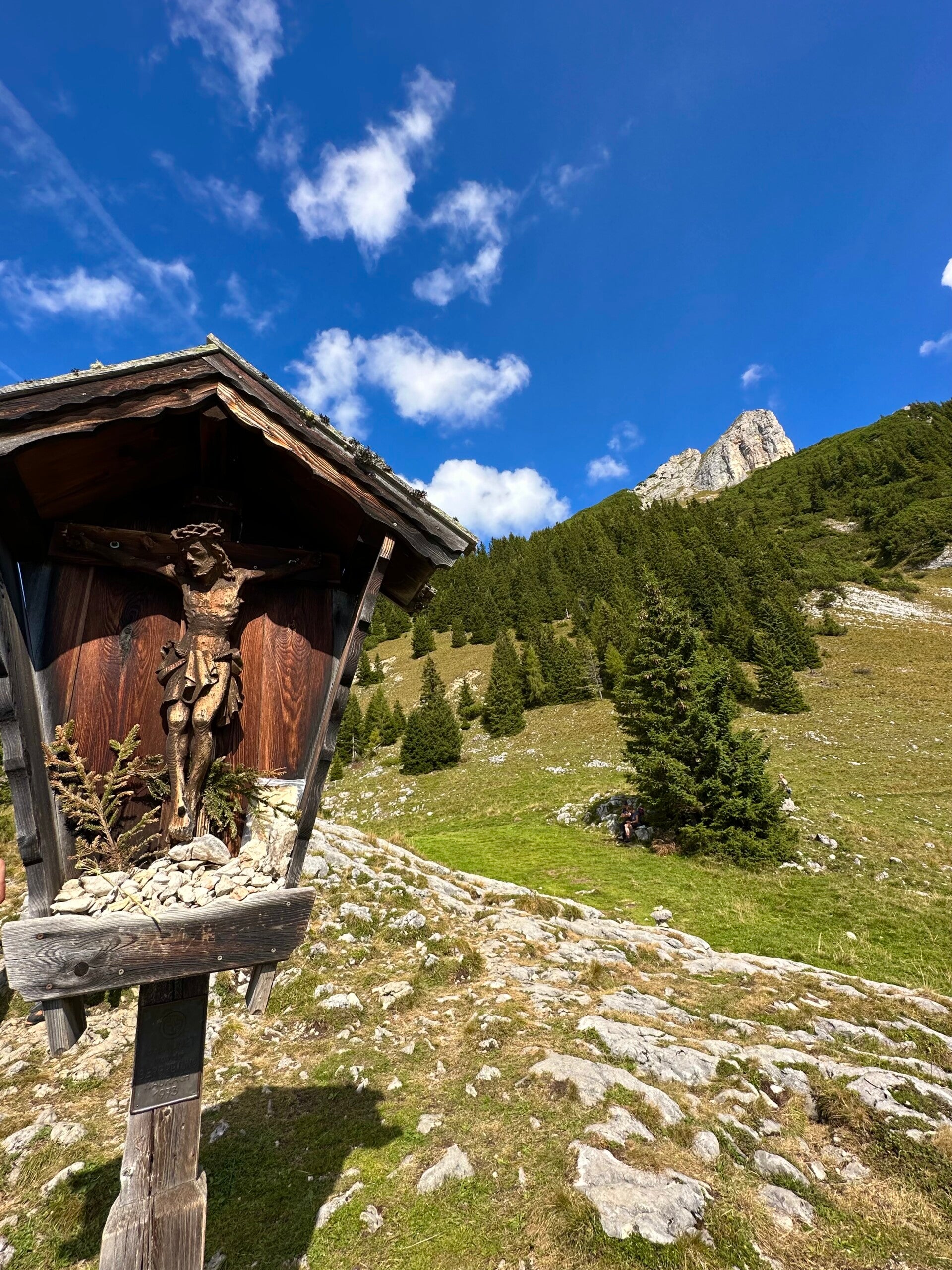 Aus dem Waldstück heraustretend, offenbarte sich uns wieder ein unvergesslicher Anblick auf den Achensee und die umliegenden Berge. Ein Holzkreuz markiert einen ausgezeichneten Aussichtspunkt und rustikale Holzliegen laden den Wanderer dazu ein, inne zu halten und den herrlichen Anblick in sich aufzusaugen.