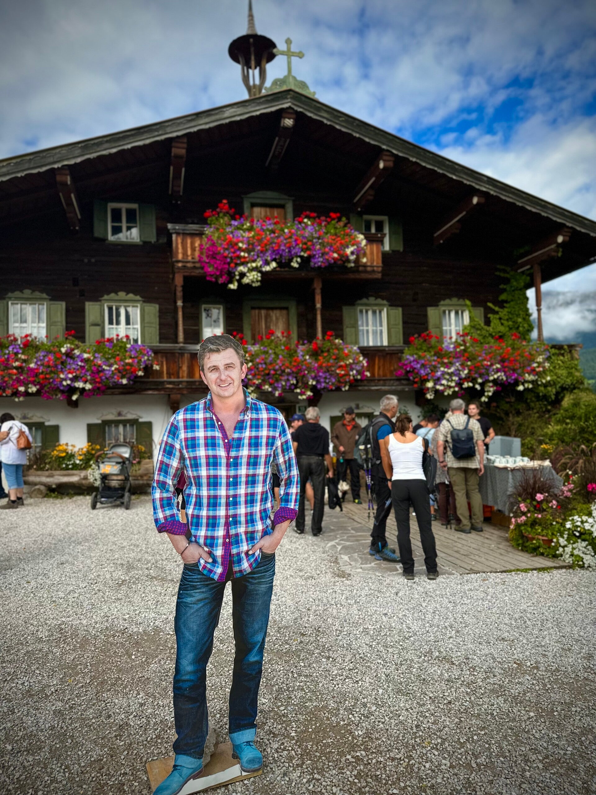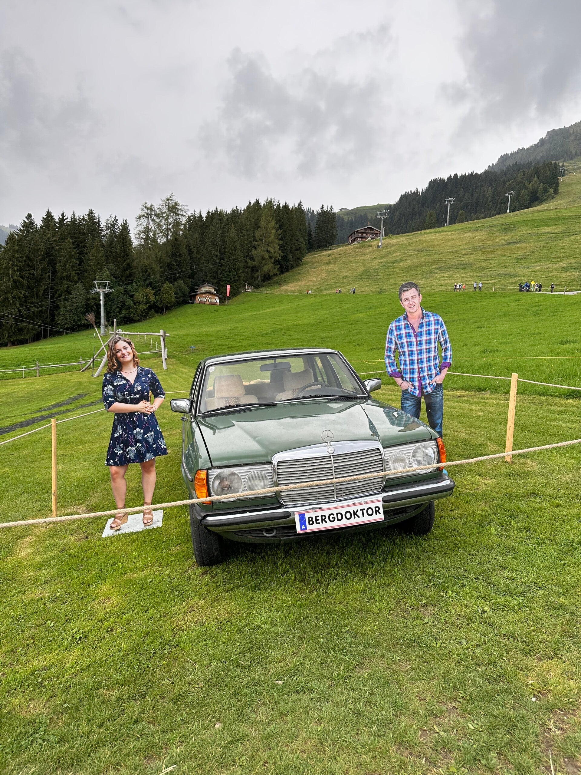 Als wir vom Gipfel zurück kamen, sah man schon ganz deutlich die Vorbereitungen für das Bergdoktor Bergfest, die Bühne stand bereits, und überall grinsten uns die Pappkameraden entgegen. Im kleinen Shop der Bergbahn entdeckete ich dann das neue Buch von Mark Keller, da ich meinen Lesestoff vergessen hatte, kam mir das gerade recht.
