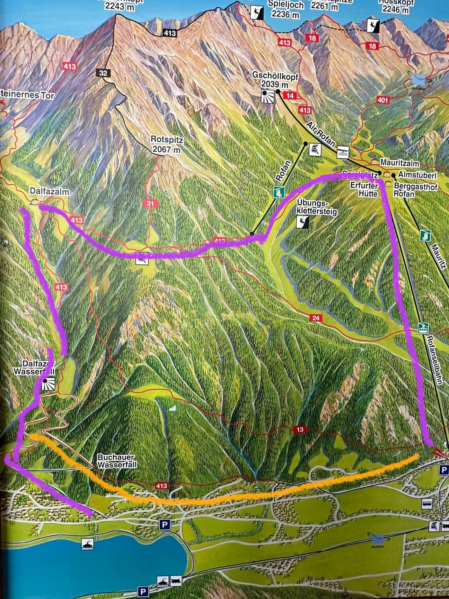 Für heute hatten wir uns vorgenommen mit der Rofan Seilbahn auf den Berg zu fahren, um von der Bergstation - auf einem relativ ebenen Wanderweg - zur Dafalzalm zu wandern.