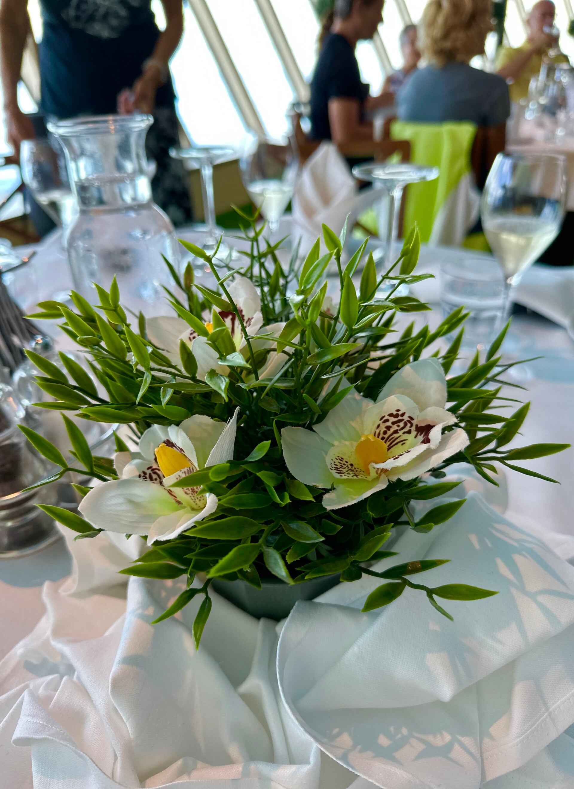 Gleich am ersten Seetag freuten wir uns sehr über eine Einladung zur Geburtstagsfeier einer lieben Mitreisenden aus der Linedancegruppe. Wir gingen gemeinsam - 18 Personen - zum Mittagessen, bei welchem die Mitarbeiter im Service sie mit lauten Trommeln und Gesängen hoch leben ließen, und wir uns leckeren Sekt zu Gemüte führten.