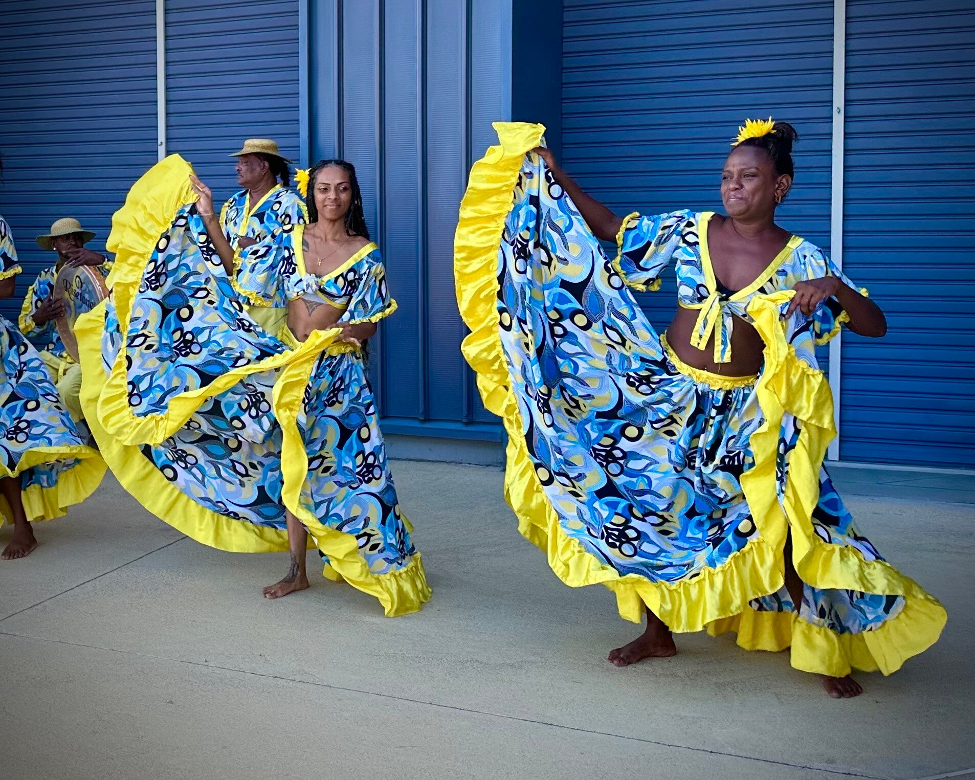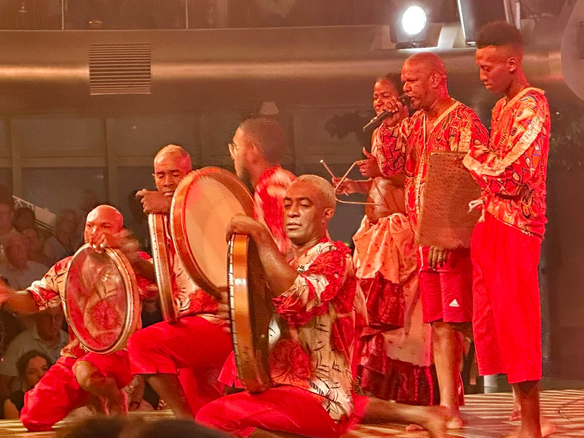 Im Hafen von Port Louis - nach dem Durchqueren des absolut neuwertigen und modernen Cruisecenters - empfingen uns einheimische Klänge und attraktive junge Damen in strahlenden Kostümen tanzen für uns.